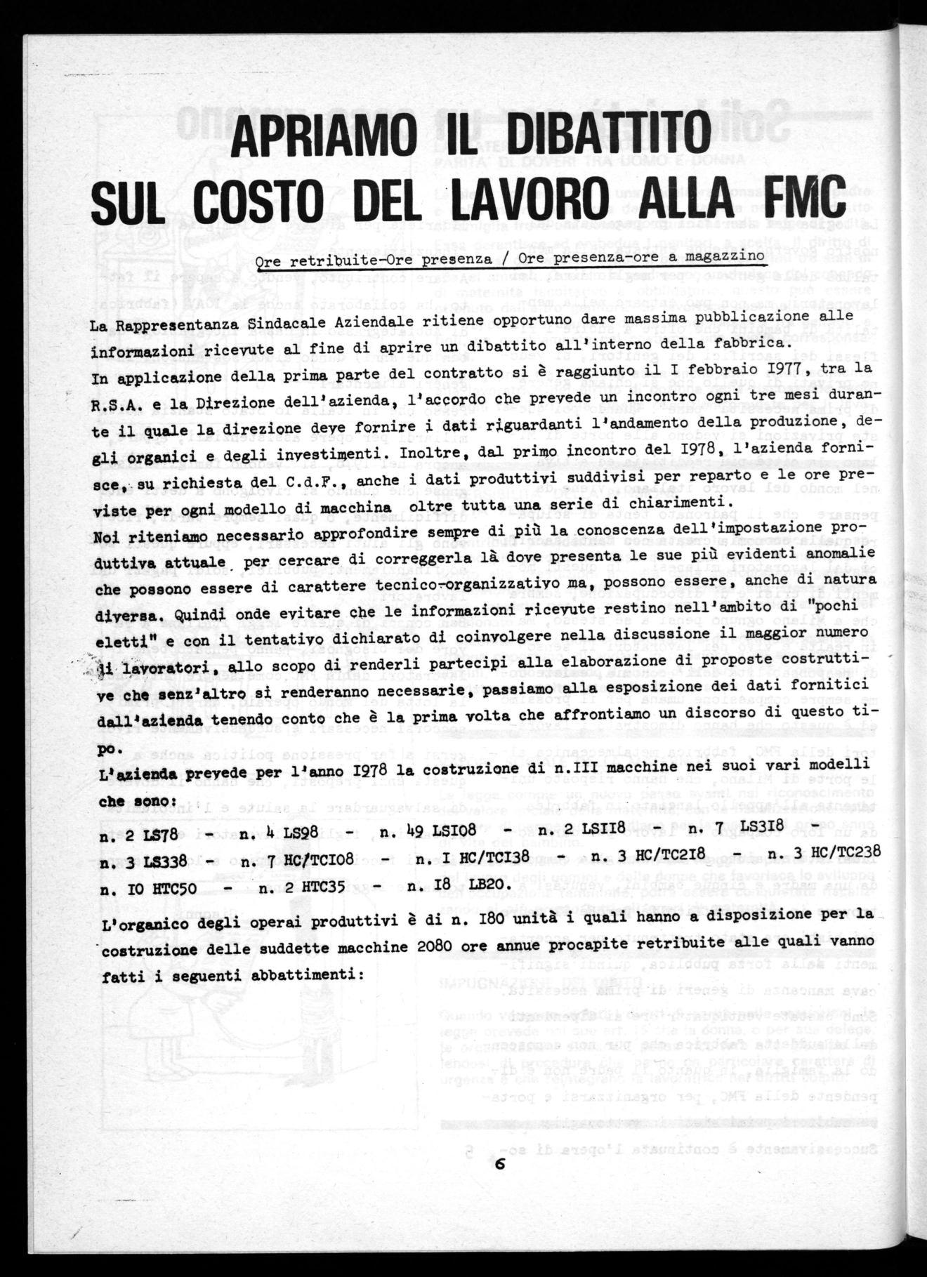 La Rappresentanza Sindacale Aziendale ritiene opportuno dare massima pubblicazione alle informazioni ricevute al fine di aprire un dibattito all'interno della fabbrica. In applicazione della prima parte del contratto si è raggiunto il I febbraio 1977, tra la R.S.A. e la Direzione dell'azienda, l'accordo che prevede un incontro ogni tre mesi durante il quale la direzione deve fornire i dati riguardanti l'andamento della produzione, degli organici e degli investimenti. Inoltre, dal primo incontro del 1978, l'azienda fornisce, su richiesta del C.d.F., anche i dati produttivi suddivisi per reparto e le ore previste per ogni modello di macchina oltre tutta una serie di chiarimenti.