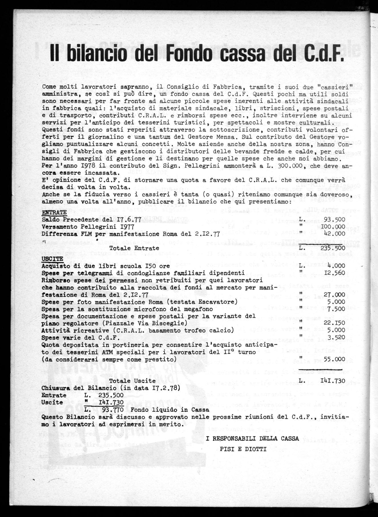 Come molti lavoratori sapranno, il Consiglio di Fabbrica, tramite i suoi due "cassieri" amministra, se così si può' dire, un fondo cassa del C.d.F. Questi pochi ma utili soldi sono necessari per far fronte ad alcune piccole spese inerenti alle attività sindacali in fabbrica quali: l'acquisto di materiale sindacale, libri, striscioni, spese postali e di trasporto, contributi C.R.A.L. e rimborsi spese ecc., inoltre interviene su alcuni servizi per l'anticipo dei tesserini turistici, per spettacoli e mostre culturali.