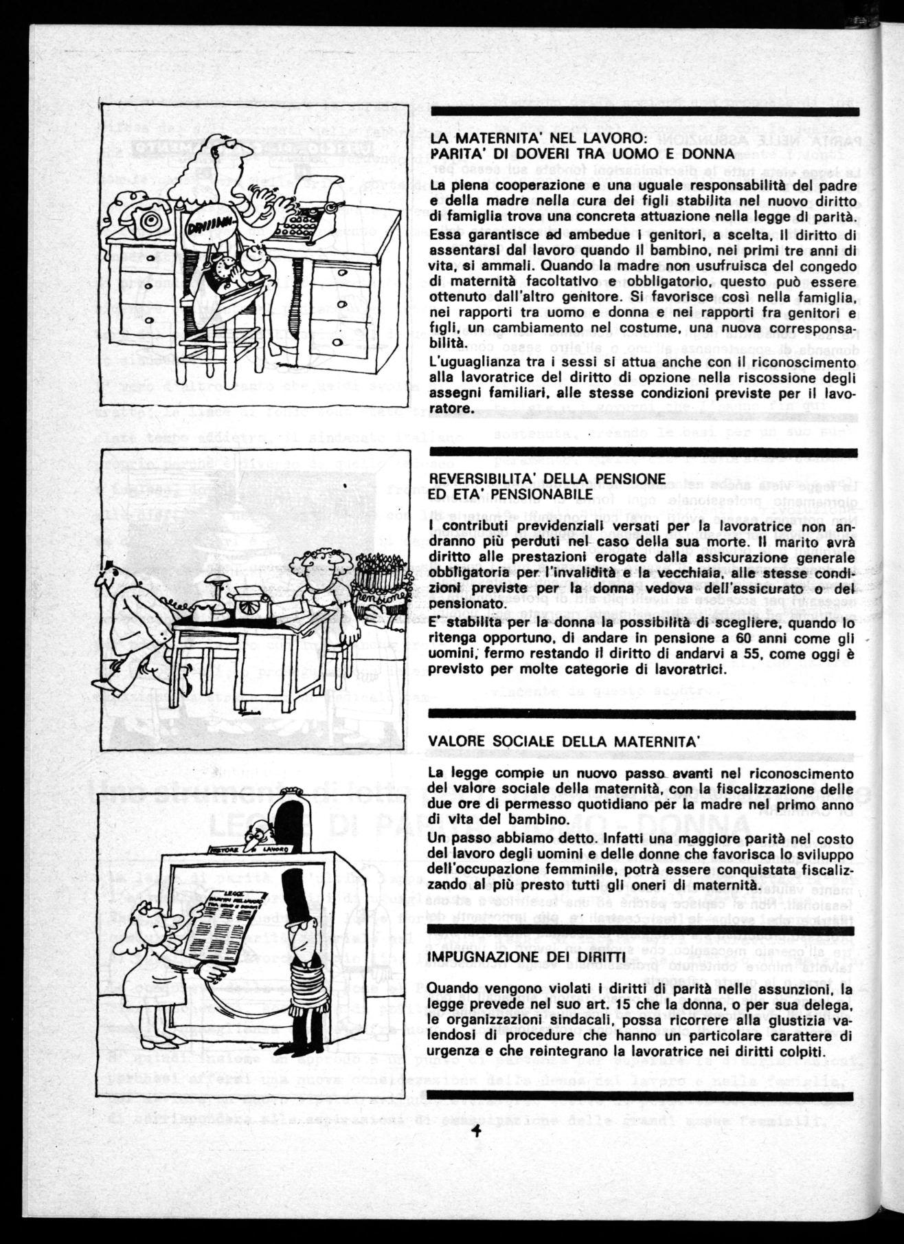 La piena cooperazione e una uguale responsabilità del padre e della madre nella cura dei figli stabilita nel nuovo diritto di famiglia trova una concreta attuazione nella legge di parità . Essa garantisce ad ambedue i genitori, a scelta, Il diritto di assentarsi dal lavoro quando II bambino, nei primi tre anni di vita, si ammali. Quando la madre non usufruisca del congedo di maternità facoltativo e obbligatorio, questo può essere ottenuto dall'altro genitore. Si favorisce così nella famiglia, nei rapporti tra uomo e donna e nei rapporti fra genitori e figli, un cambiamento nel costume, una nuova corresponsabilità .