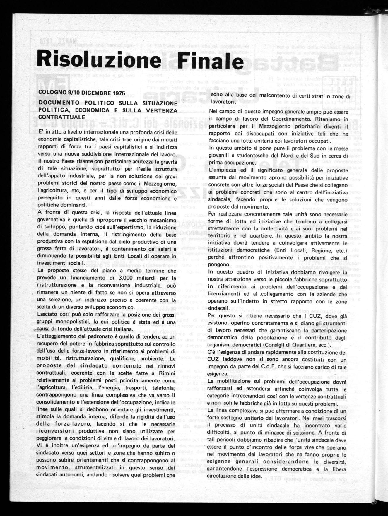 La mobilitazione sui problemi dell'occupazione dovrà rafforzarsi ed estendersi affinchè coinvolga tutte le categorie intrecciandosi così con le vertenze contrattuali e non isoli le fabbriche già in lotta su questi problemi. La linea complessiva si può affermare a condizione di un forte sostegno unitario dei lavoratori. Nei mesi trascorsi il processo di unità sindacale ha incontrato varie difficoltà, al punto dì minacce di scissione. A fronte di tali pericoli dobbiamo ribadire che l'unità sindacale deve essere il punto d'incontro delle forze vive che operano nel movimento dei lavoratori che ne fanno proprie le esigenze generali considerandone le diversità, garantendone l'espressione democratica e la libera circolazione delle idee.