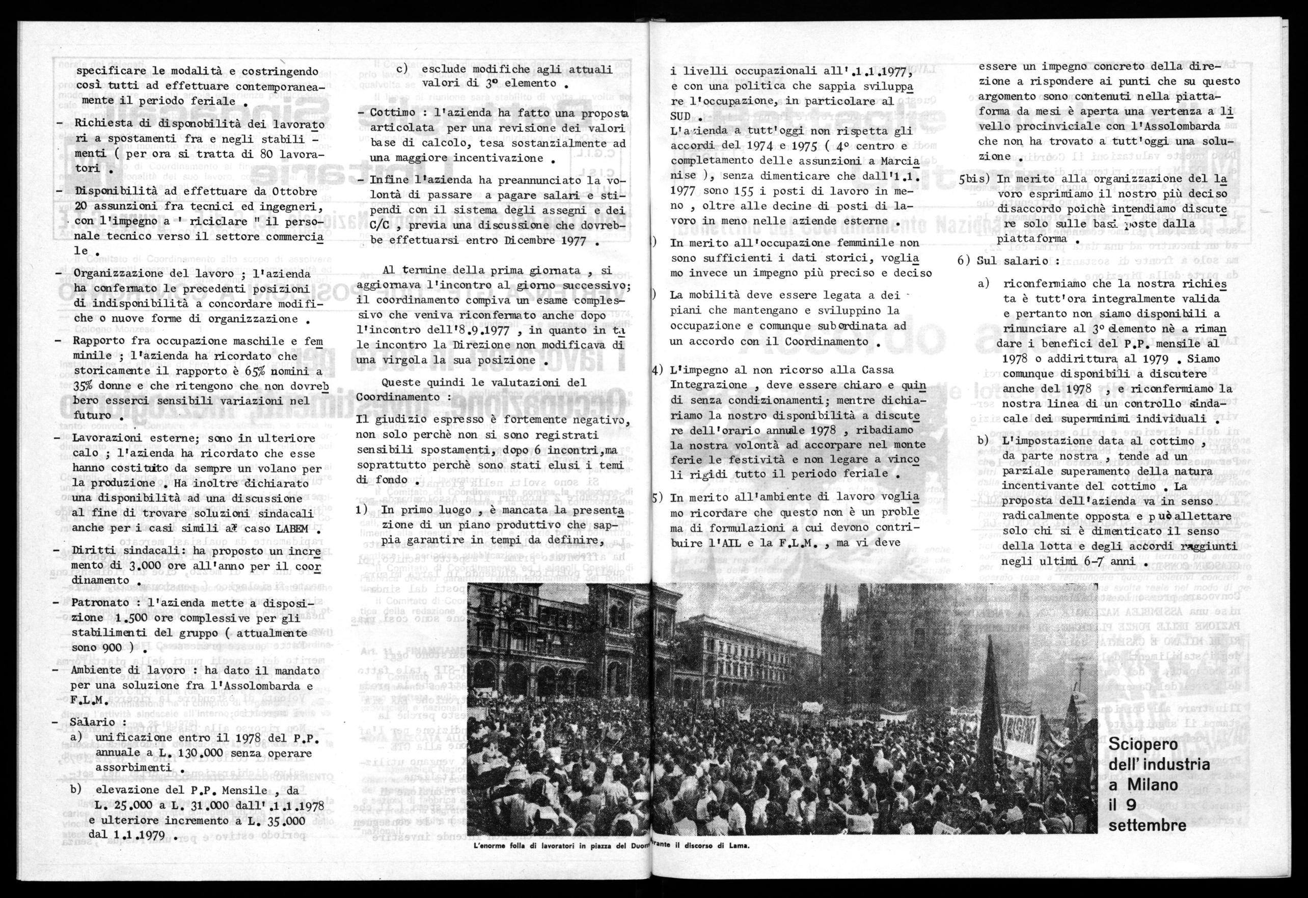 Non abbiamo voluto in questo comunicato riprendere analiticamente tutti i punti ma ci è sembrato più utile sottolineare i punti sostanziali del disaccordo . Dopo queste valutazioni il Coòrdinamento e la F.L.M. hanno ritenuto di aggiornare l'incontro a tempi più lunghi e precisamen te al 22 Settembre . Abbiamo ritenuto che l'azienda debba rivedere profondamente le sue posizioni, siamo comunque disponibili ad un incontro ad una data prima del 22, ma solo a fronte di sostanziali mutamenti da parte della Direzione .