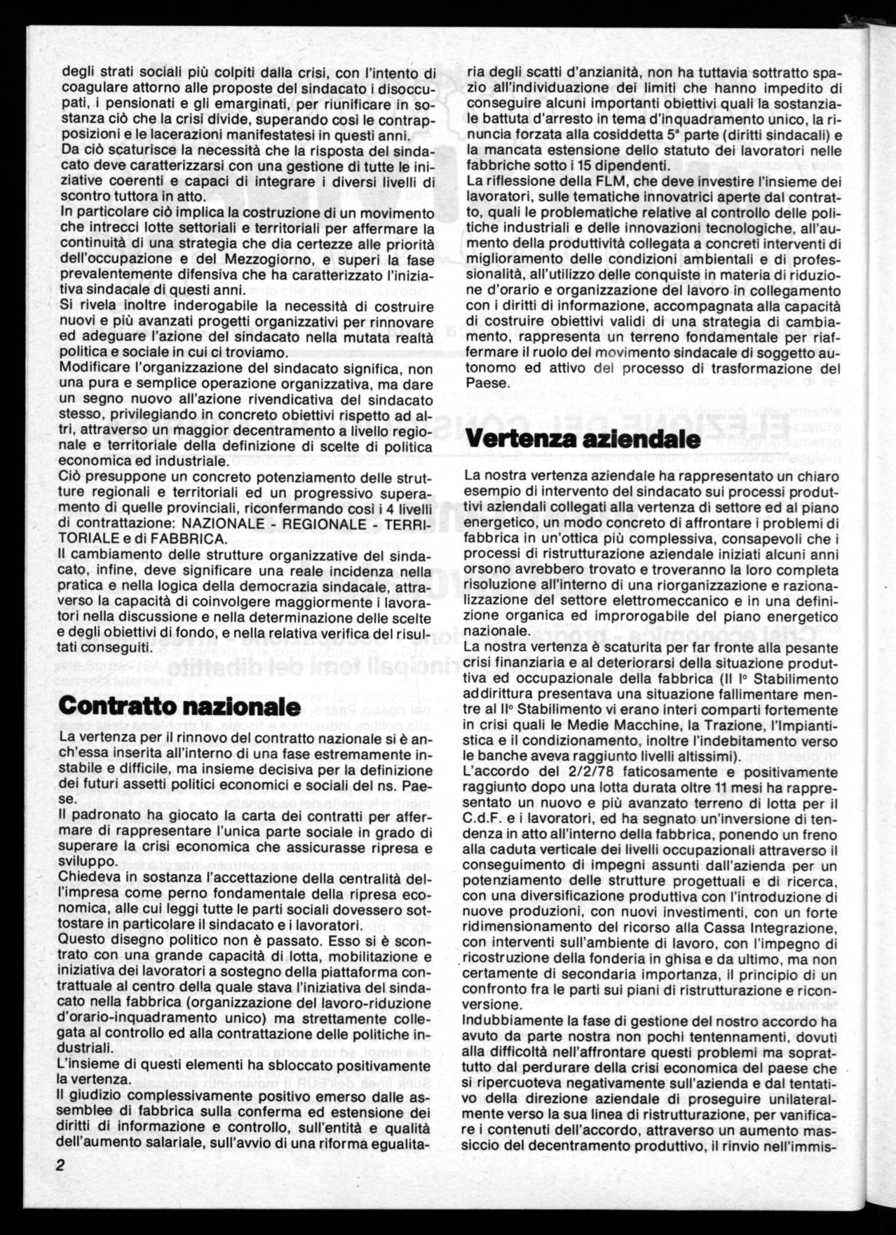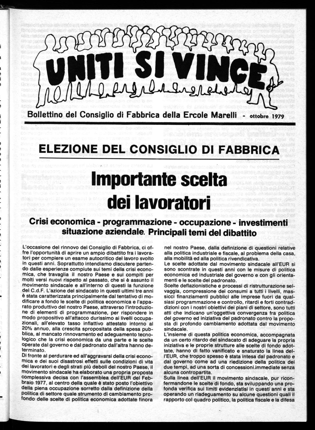 L'occasione del rinnovo del Consiglio di Fabbrica, ci offre l'opportunità di aprire un ampio dibattito fra i lavoratori per compiere un esame autocritico del lavoro svolto in questi anni. Soprattutto intendiamo discutere partendo dalle esperienze compiute sui temi della crisi economica, che travaglia il nostro Paese e sui compiti per molti versi nuovi rispetto al passato, che si è assunto il movimento sindacale e all'interno di questi la funzione del C.d.F. L'azione del sindacato in questi ultimi tre anni è stata caratterizzata principalmente dal tentativo di modificare a fondo le scelte di politica economica e l'apparato produttivo del nostro Paese, attraverso l'introduzione di elementi di programmazione, per rispondere in modo propositivo all'attacco durissimo ai livelli occupazionali, all'elevato tasso inflattivo attestato intorno al 20% annuo, alla crescita spropositata della spesa pubblica, al mancato rinnovamento ed adeguamento tecnologico che la crisi economica da una parte e le scelte operate dal governo e dal padronato dall'altra hanno determinato.