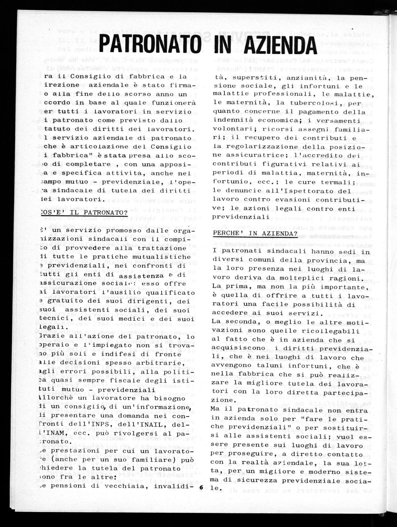 ra il Consiglio di fabbrica e la irezione aziendale è stato firmao alla fine dello scorso anno un ccordo in base al quale funzionerà er tutti i Lavoratori in servizio i patronato come previsto dallo tatuto dei diritti dei lavoratori. 1 servizio aziendale di patronato che è articolazione del Consiglio i fabbrica" è stata presa allo sco,o di completare , con una apposia specifica attività, anche nel rampo mutuo - previdenziale, 1_'opea sindacale di tutela dei diritti lei lavoratori.