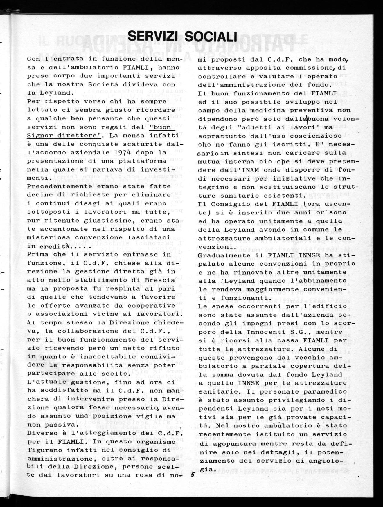 Le spese occorrenti per l'edificio sono state assunte dall'azienda secondo gli impegni presi con lo scorporo della Innocenti S.G., mentre si è ricorsi alla cassa FIAMLI per tutte le attrezzature. Alcune di queste provengono dal vecchio ambulatorio a parziale copertura della somma dovuta dal fondo Leyland a quello INNSE per le attrezzature sanitarie. Ii personale paramedico è stato assunto privilegiando i dipendenti Leyland sia per i noti motivi sia per le già provate capacità. Nel nostro ambùIatorio è stato recentemente istituito un servizio di agopuntura mentre resta da definire solo nei dettagli, il potenziamento del servizio di angiologia.