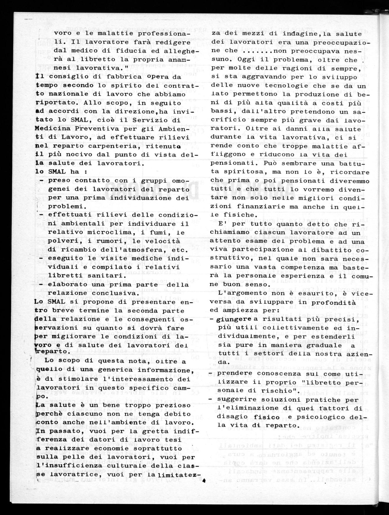 Il consiglio di fabbrica opera da tempo secondo lo spirito del contratto nazionale di lavoro che abbiamo riportato. Allo scopo, in seguito ad accordi con la direzione,ha invitato lo SMAL, cioè il Servizio di Medicina Preventiva per gli Ambienti di Lavoro, ad effettuare rilievi nel reparto carpenteria, ritenuto il più nocivo dal punto di vista della salute dei lavoratori.