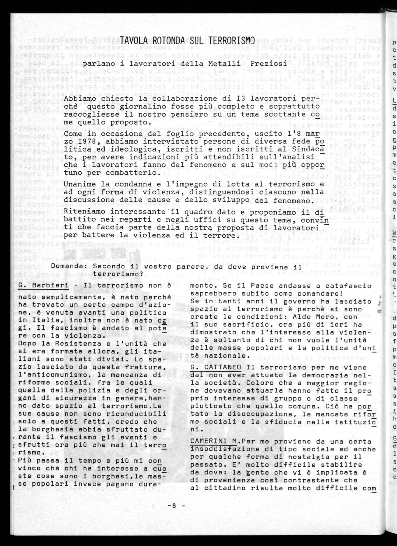 Come in occasione del foglio precedente, uscito l'8 mar zo 1978, abbiamo intervistato persone di diversa fede Fo litica ed ideologica, iscritti e non iscritti al Sindaca to, per avere indicazioni più attendibili sull'analisi che i lavoratori fanno del fenomeno e sul moc,, più oppor tuno per combatterlo.