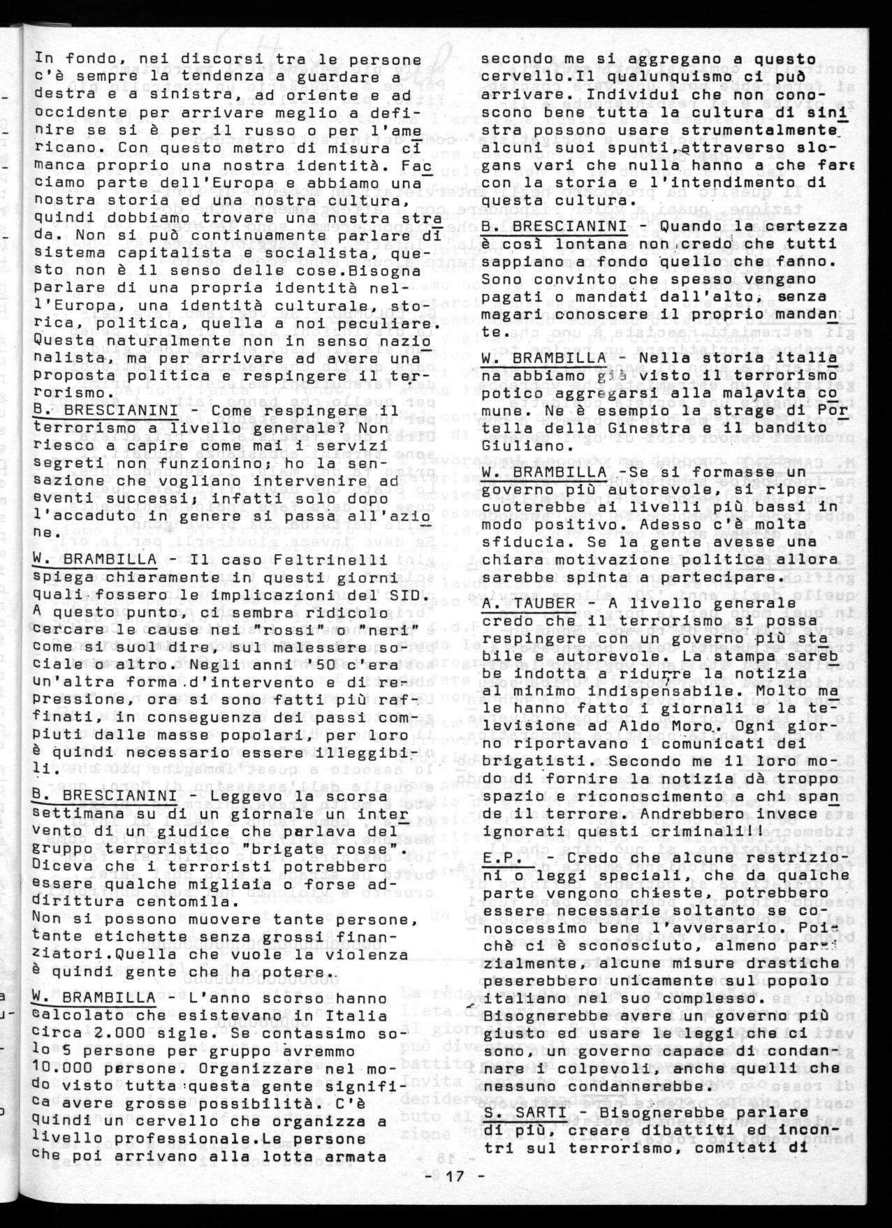 W. BRAMBILLA - A mio parere, il terrerismo non è nel malessere sociale,perchè se analizziamo b ene le figure dei brigatisti arrestat i (cosa facevano,chi erano ecc.) ci a ccorgiamo che è gente che bene o male poteva avere un certo be riessere economic o e quindi da questo puri to di vista non eranoemarginati. ragione della nascita e crescita del - errorismo, seco ndo me, va ricercata nei otivi politici. Negli ultimi anni c'è del malessere so ciale che può indurre a Pensare che il t erorismo venga da questo fenomeno, credo però, che una certa forma di collaborazione tra cosiddetto Partito armato e alcune frange di estremismo parlamentare sia più di natura inconsapevole che effettivamente voluta. Io cercherei la provenienza nella strut tura della società italiana, nelle cla s si e nei gruppi ai quali interessa que-1sto fenomeno. Sono convinto che la classe conservatrice italiana, da quella più illuminata, a quella più deleteria, lo ha insegnato il fascismo, sia l'origine del terrorismo.