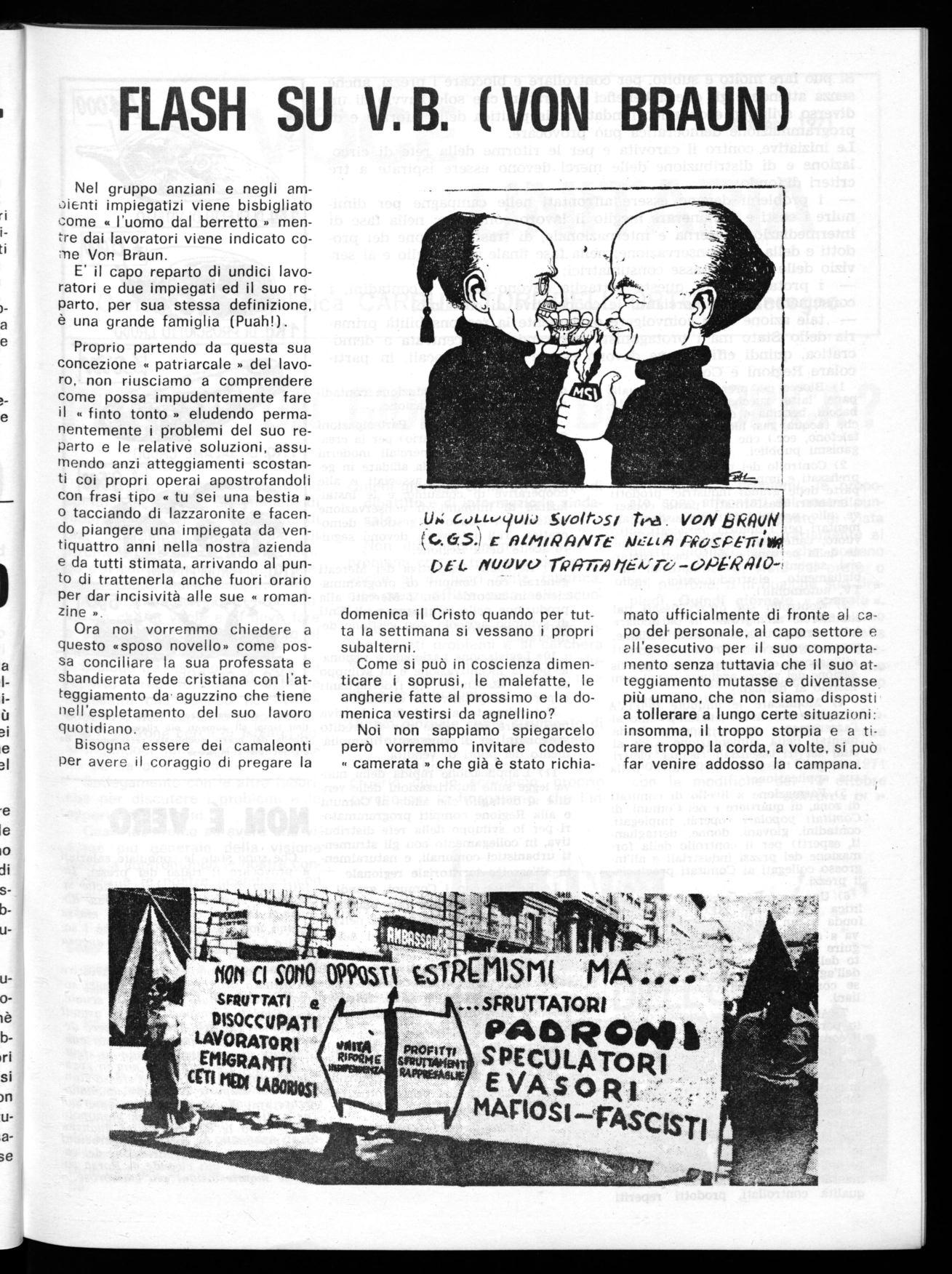 Un tipo di società che tende ad ostacolare ogni nostro intendimento di organizzarci sindacalmente e • politicamente, che ci impone lo eterno assillo della quadratura della busta paga, il terrore di un figlio dopo il primo o il secondo, il pensiero dell'affitto astronomico, delle medicine costosissime e delle visite fuori mutua.