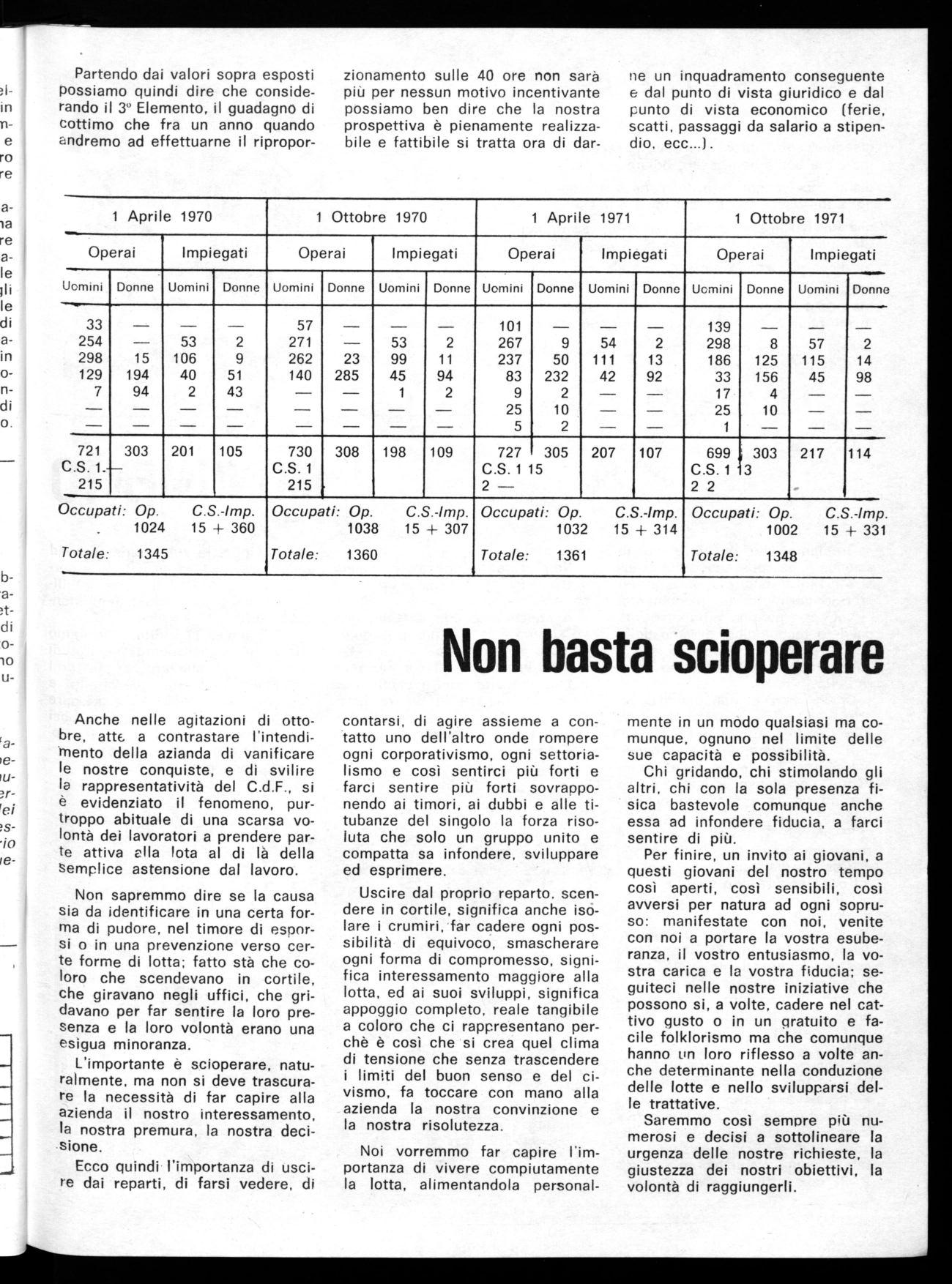 aia re ale ;li le di ain ondi o. ba;tdí olo u1 Aprile 1970 1 Ottobre 1970 1 Aprile 1971 1 Ottobre 1971 Operai Impiegati Operai Impiegati Operai Impiegati Operai Impiegati Uomini Donne Uomini Donne Uomini Donne Uomini Donne Uomini Donne Uomini Donne Uomini Donne Uomini Donne 33 — 57 — — 101 — 139 — 254 — 53 2 271 — 53 2 267 9 54 2 298 8 57 2 298 15 106 9 262 23 99 11 237 50 111 13 186 125 115 14 129 194 40 51 140 285 45 94 83 232 42 92 33 156 45 98 7 94 2 43 — — 1 2 9 2 — 17 4 — — — — — — — — — 25 10 — — 25 10 — — — — — — — — — 5 2 — 1 — 721 303 201 105 730 308 198 109 727 305 207 107 699 i 303 217 114 C.S. 1. C.S. 1 C.S. 1 15 C.S. 1 ' 3 215 215 , 2 — 2 2 )ccupati: Op. C.S.-Imp. Occupati: Op. C.S.-lmp. Occupati: Op. C.S.-Imp. Occupati: Op. C.S.-Imp. 1024 15 + 360 1038 15 + 307 1032 15 + 314 1002 15 + 331 Totale: 1345 Totale: 1360 Totale: 1361 Totale: 1348 Non basta scioperare `areruei 'io re-