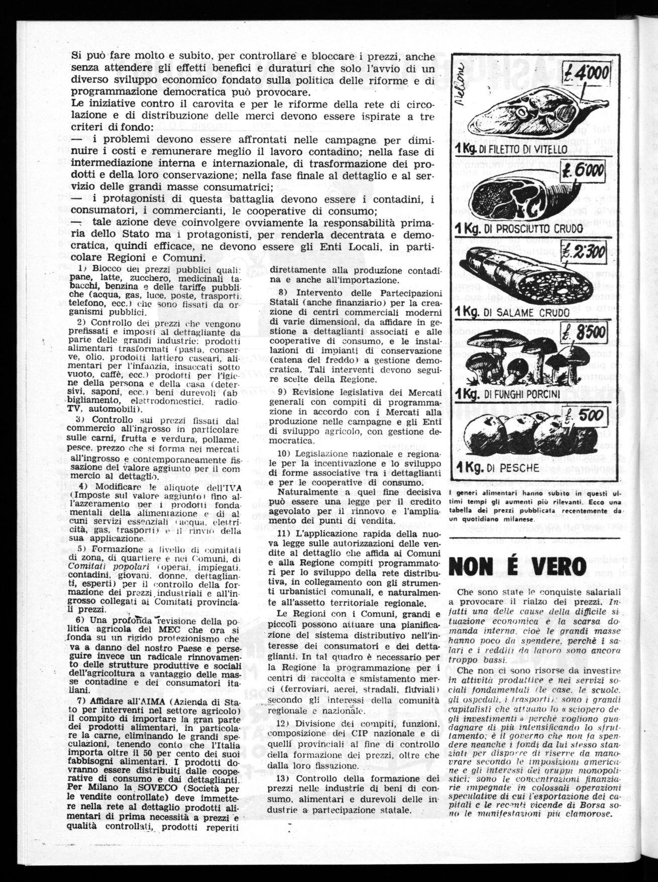 Affidare all'AIMA (Azienda di Stato per interventi nel settore agricolo) il compito di importare la gran parte dei prodotti alimentari, in particolare la carne, eliminando le grandi speculazioni, tenendo conto che l'Italia importa oltre il 50 per cento dei suoi fabbisogni alimentari. I prodotti dovranno essere distribuiti dalle cooperative di consumo e dai dettaglianti. Per Milano laSOVECO (Società per le vendite contr ollate) deve immettere nella rete al dettaglio prodotti alimentari di prima necessità a prezzi 'e qualità controllati, prodotti reperiti