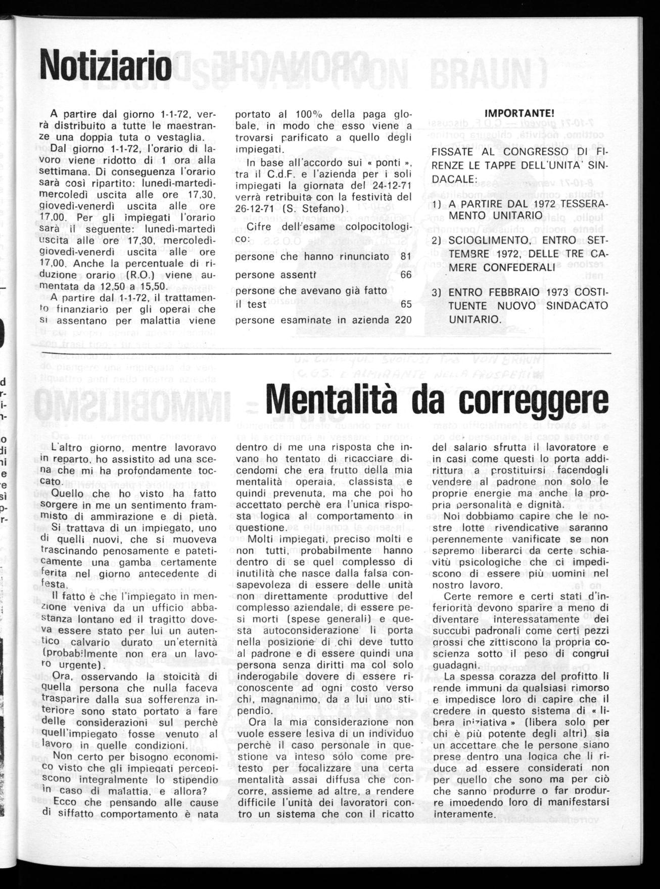 Dal giorno 1-1-72, l'orario di lavoro viene ridotto di 1 ora alla settimana. Di conseguenza l'orario sarà così ripartito: lunedì-martedìmercoledì uscita alle ore 17,30, giovedì-venerdì uscita alle ore 17,00. Per gli impiegati l'orario sarà il seguente: lunedì-martedì uscita alle ore 17,30, mercoledìgiovedì-venerdì uscita alle ore 17,00. Anche la percentuale di riduzione orario (R.0.) viene aumentata da 12,50 a 15,50.