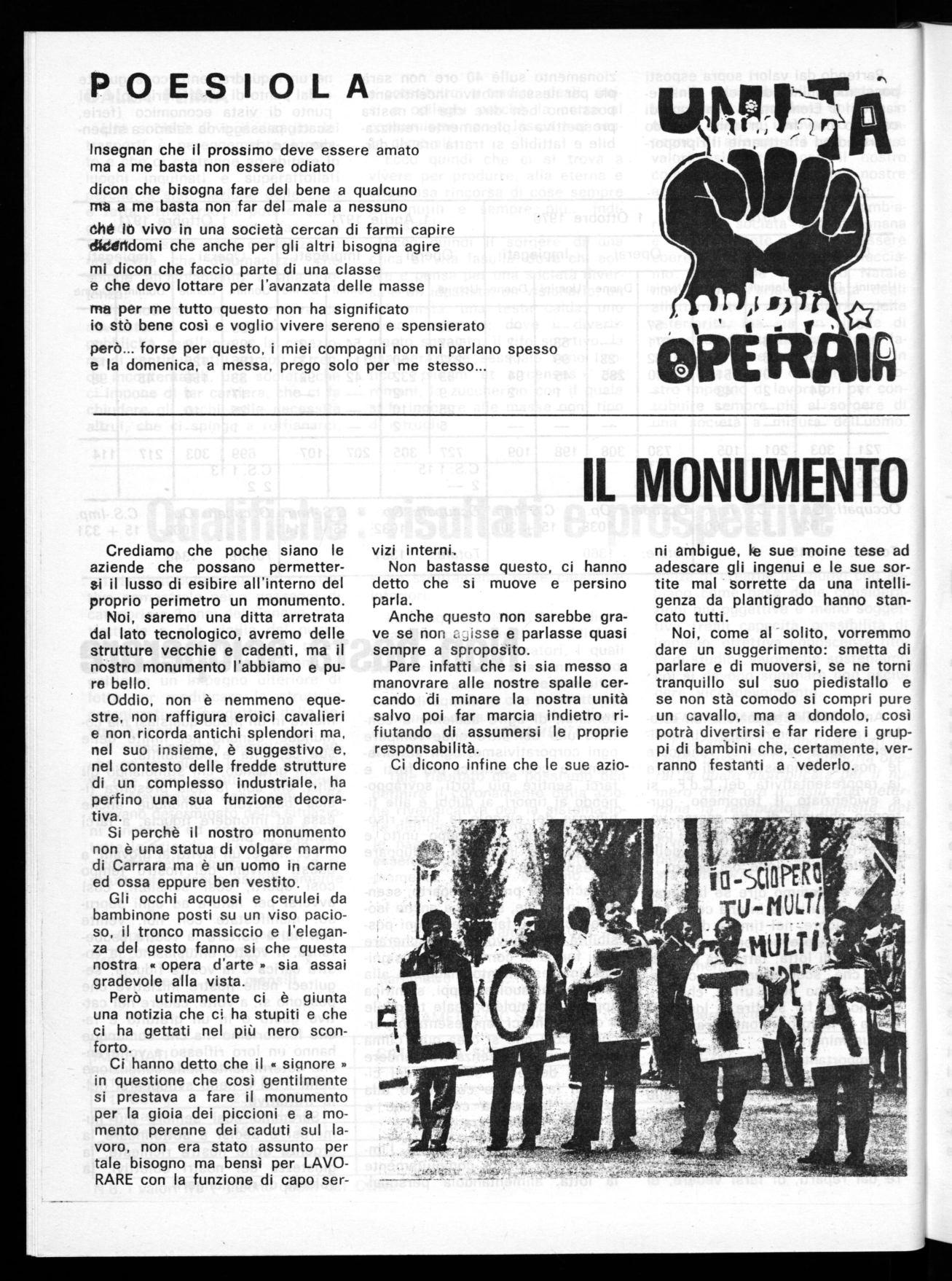 Uscire dal proprio reparto. scendere in cortile, significa anche isàlare i crumiri, far cadere ogni possibilità di equivoco, smascherare ogni forma di compromesso, significa interessamento maggiore alla lotta, ed ai suoi sviluppi, significa appoggio completo, reale tangibile a coloro che ci rappresentano perchè è così che si crea quel clima di tensione che senza trascendere i limiti del buon senso e del civismo, fa toccare con mano alla azienda la nostra convinzione e la nostra risolutezza.