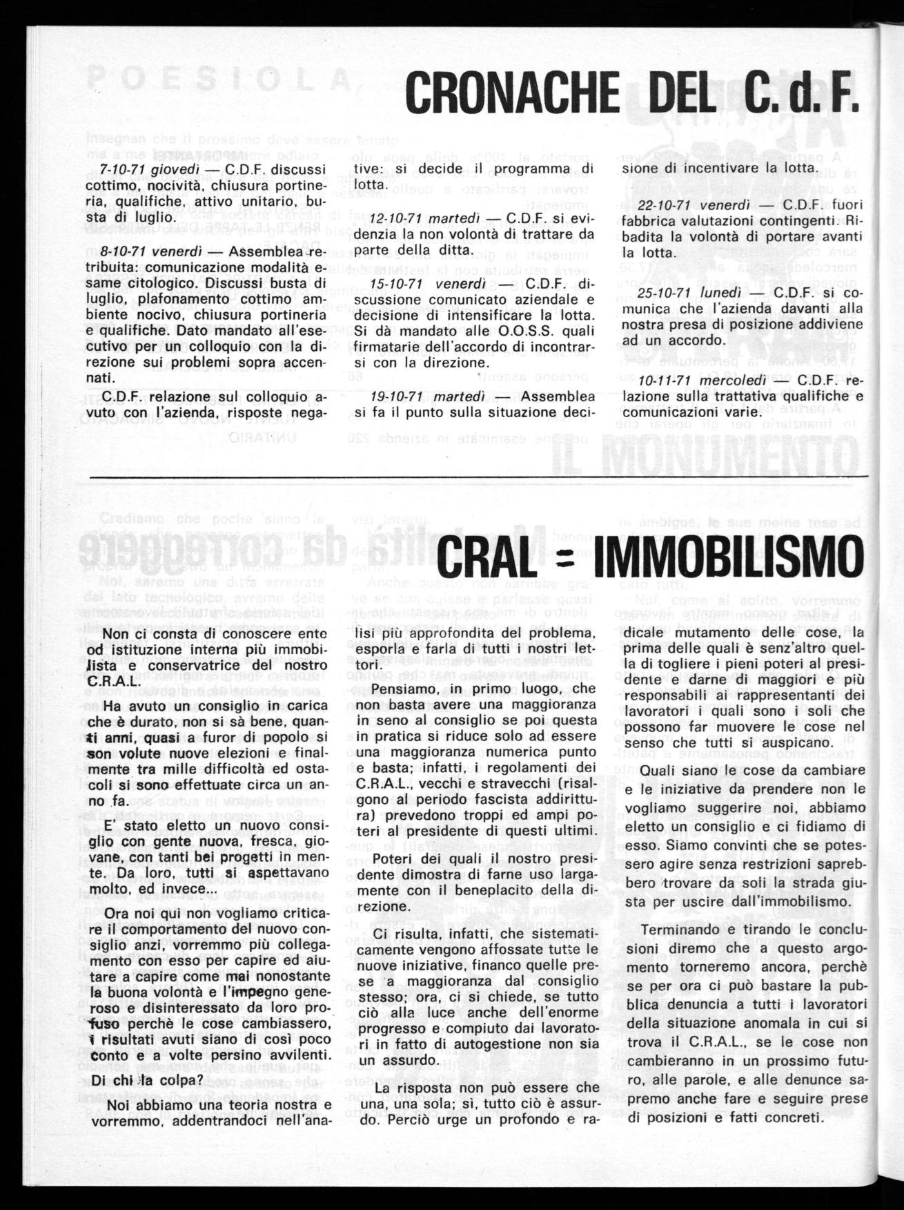 Anche nelle agitazioni di ottobre, atte a contrastare l'intendimento della azianda di vanificare le nostre conquiste, e di svilire la rappresentatività del C.d.F., si è evidenziato il fenomeno, purtroppo abituale di una scarsa volontà dei lavoratori a prendere parte attiva &la lota al di là della Semplice astensione dal lavoro.