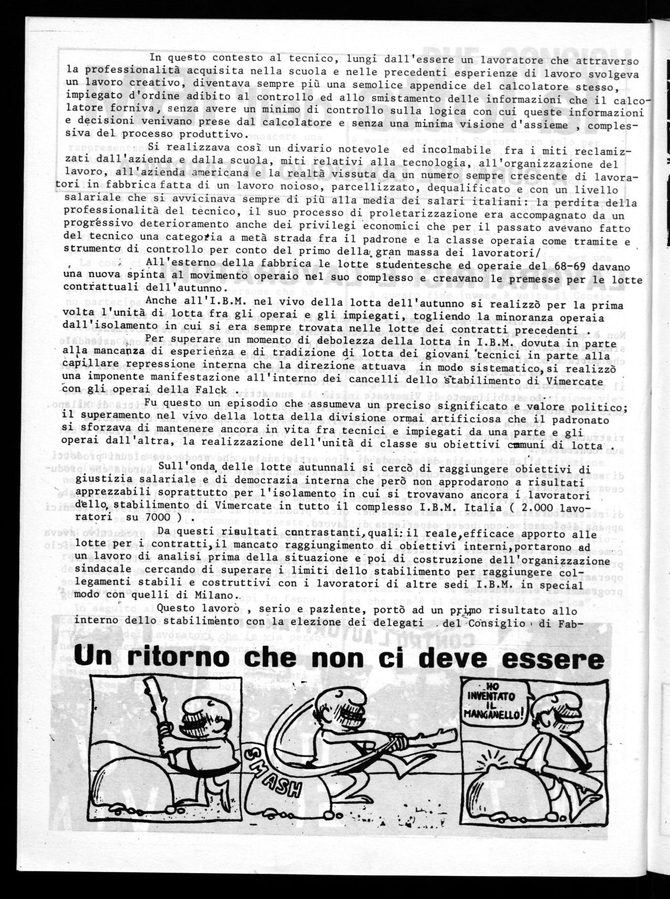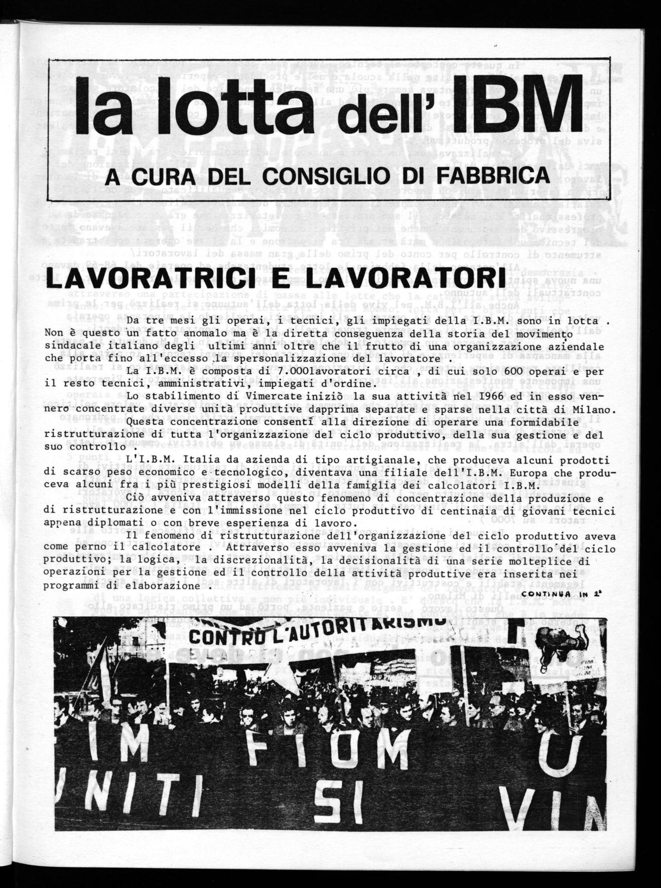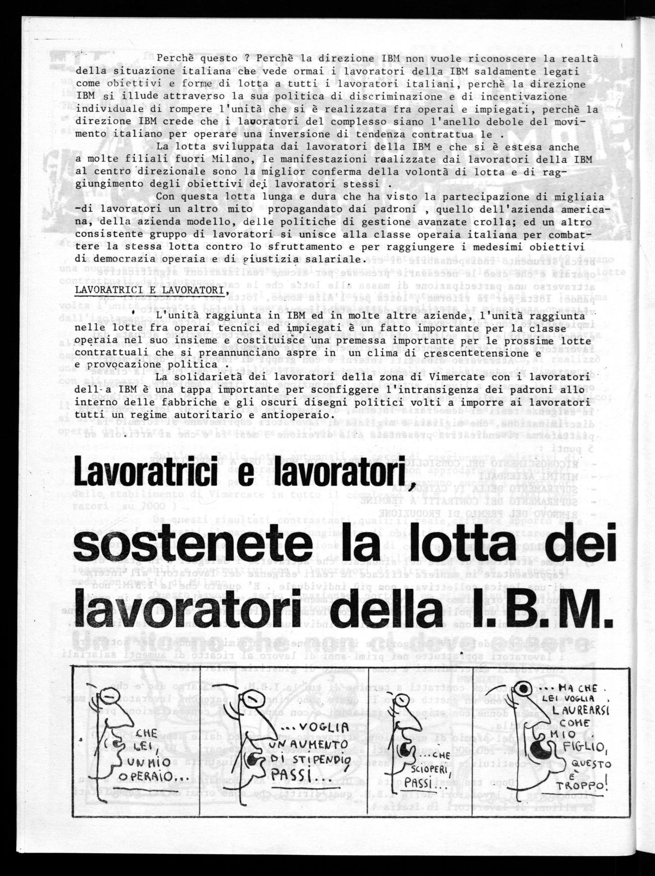 Anche all'I.B.M. nel vivo della lotta dell'autunno si realizzò per la prima volta l'unità di lotta fra gli operai e gli impiegati, togliendo la minoranza operala dall'isolamento in cui si era sempre trovata nelle lotte dei contratti precedenti