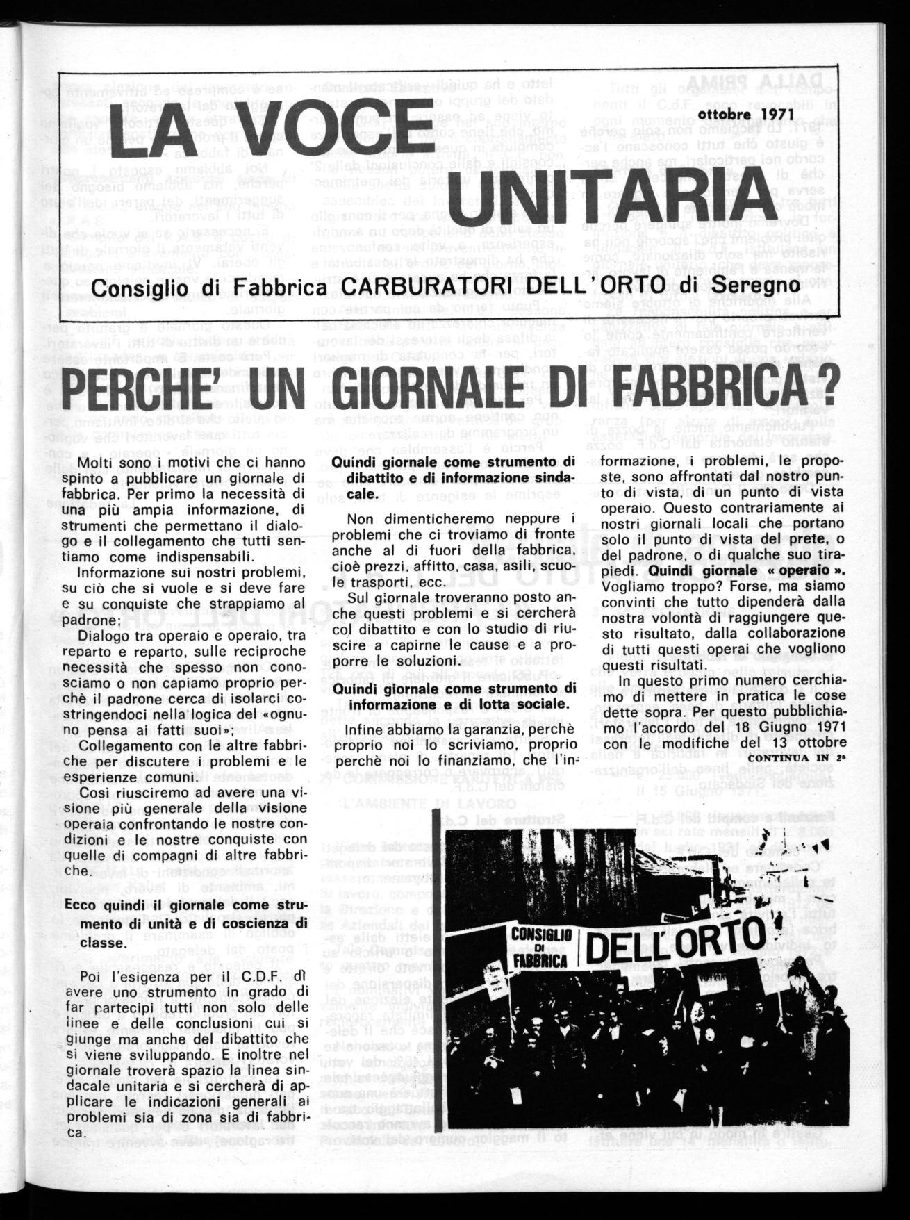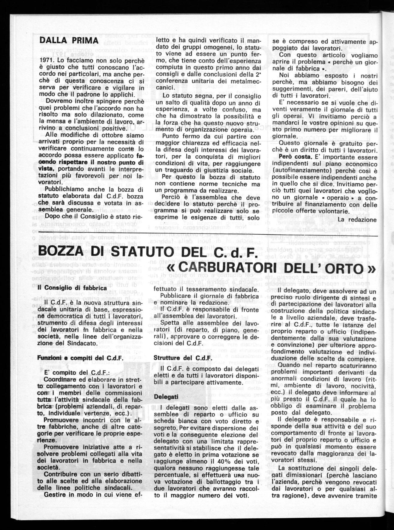 Poi l'esigenza per il C.D.F. dì avere uno strumento in grado di far partecipi tutti non solo delle linee e delle conclusioni cui si giunge ma anche del dibattito che si viene sviluppando. E inoltre nel giornale troverà spazio la linea sindacale unitaria e si cercherà di applicare le indicazioni generali ai problemi sia di zona sia di fabbrica.
