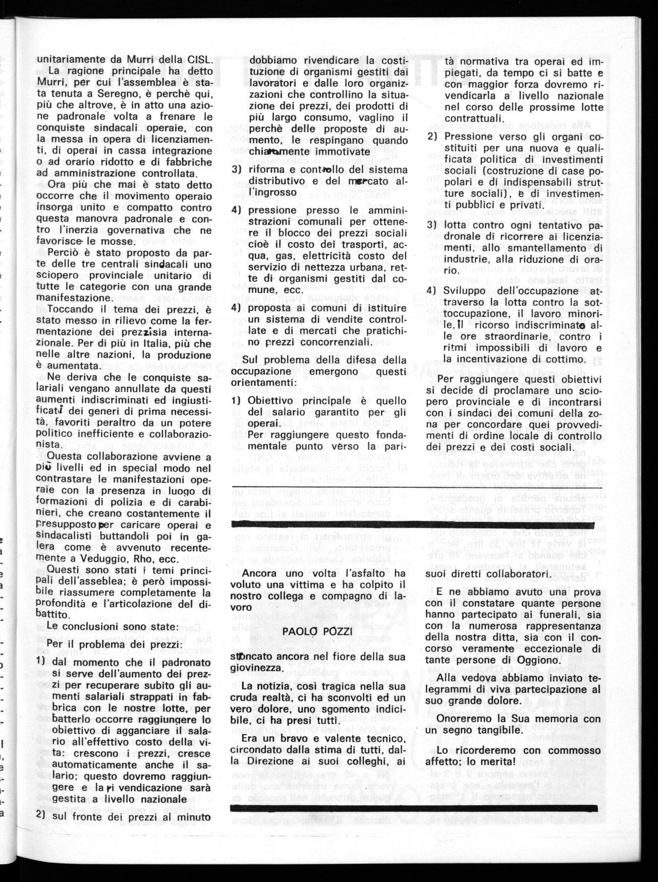 Nella nostra zona, i fatti di Veduggio, di Rho, di Nerviano, di Brugherio, di Milano, per fare qualche esempio dimostrano che dove sí lotta in modo incisivo, dove non si cede ai ricatti, dove si riesce a mettere il padronato alle corde, subito in suo aiuto intervengono i carabinieri. Non è certo una novità per il movimento operaio che dalla nascita della repubblica italiana ad oggi, ha avuto quasi 100 morti in conflitti di lavoro o politici con l'arma dei carabinieri in servizio di « ordine pubblico »; da tempo abbiamo capito che carabinieri, polizia, magistratura, sono solo degli strumenti al servizio del padronato e del governo.