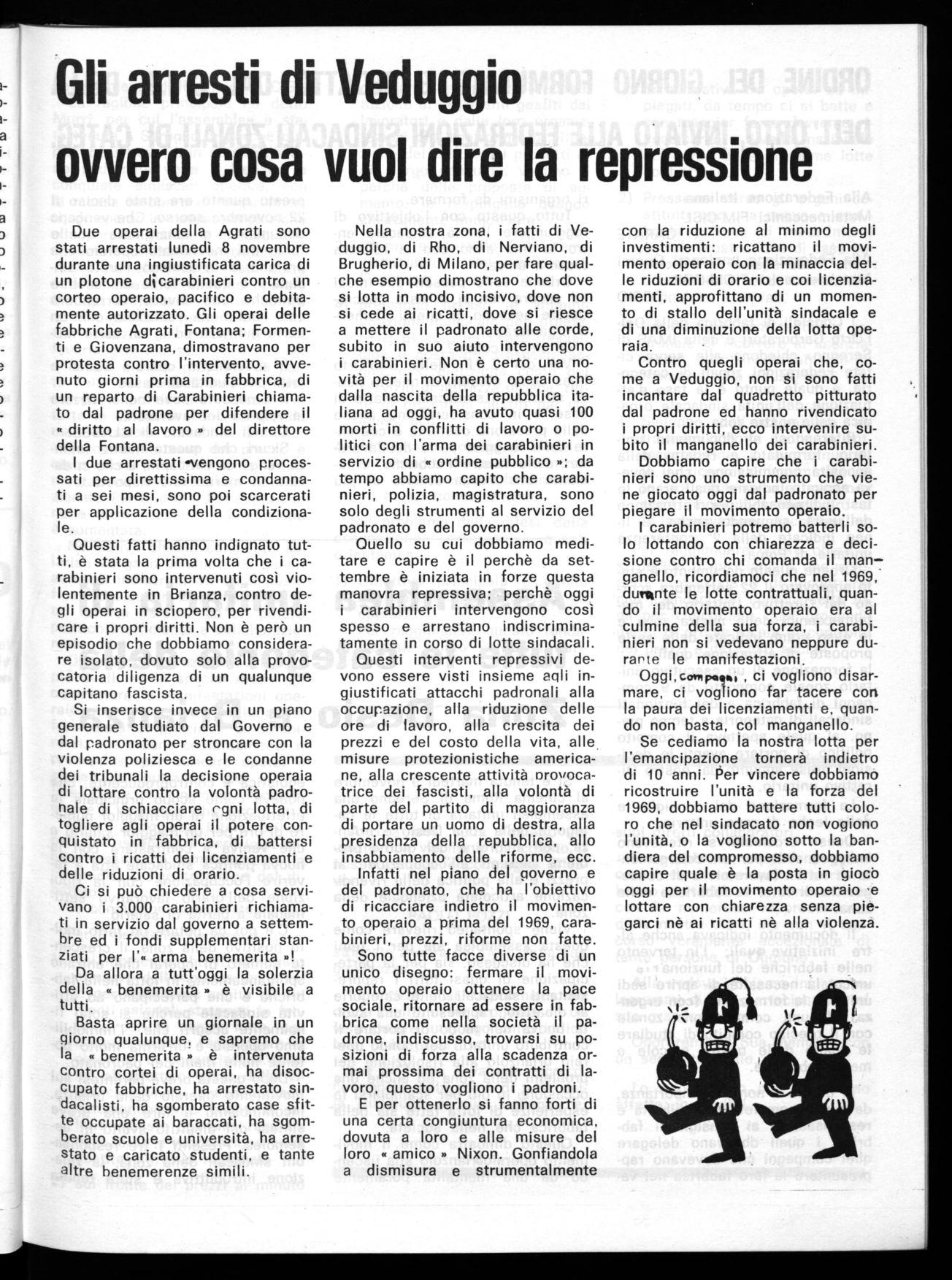 Contro quegli operai che, come a Veduggio, non sì sono fatti incantare dal quadretto pitturato dal padrone ed hanno rivendicato i propri diritti, ecco intervenire subito il manganello dei carabinieri. Dobbiamo capire che i carabinieri sono uno strumento che viene giocato oggi dal padronato per piegare il movimento operaio.
