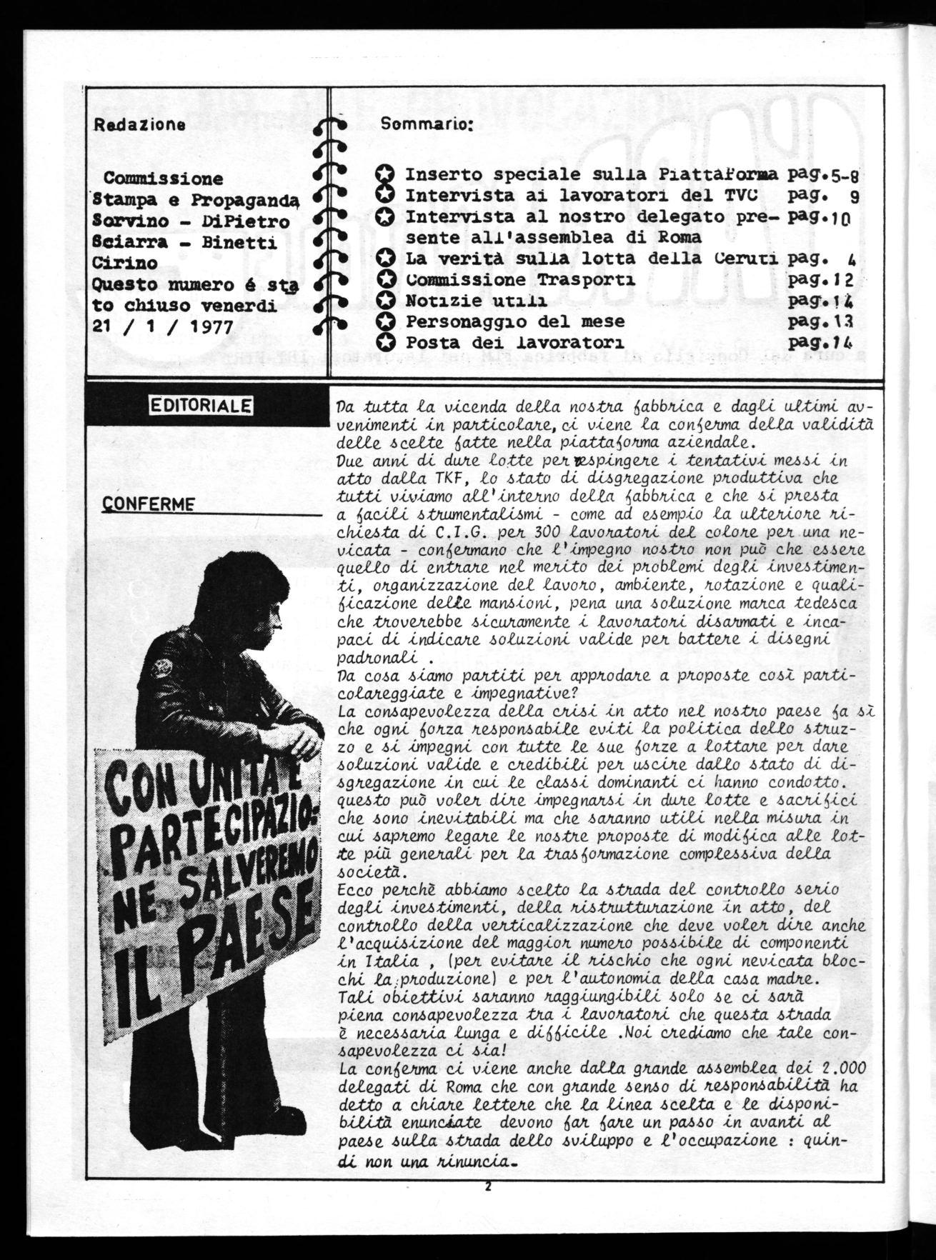 Da tutta /a vícenda de//a no4tta et.bibtíca e dagli uttímí avvenimenti_ Ln pattícolate,ci v-iene la con~ della va/ídíta delle scelte gatte nella platta0tma aziendale. Due anni dí dute lotte petlupíngete tentatíví me44í ín atto dalla TKF, lo stato dí dí4gtegazíone ptoduttíva che -tutti vívíamo all'íntetno della abbica e che 3,í presta a t acílí sttumentalísmí - come ad e4emp1io la u/tetíote tíchíe4ta dí C.I.G. per 300 lavotatotí del colore pet una nevícata - congetmano che l'impegno nostto non può che e4sete quello di enttate nel metíto del ptoblemi degfL ínve4tímenti, otganízzazíone del lavoko, ambíente, totazíone e qua/ígícazíone delle mansíoní, pena una soluzione matca -tedesca che ttovekebbe 4ícutamente - lavotatotí dísatmati e íncapací dl índícate 4o/uzíoní valide per batteke í dí4egní padtonalí .