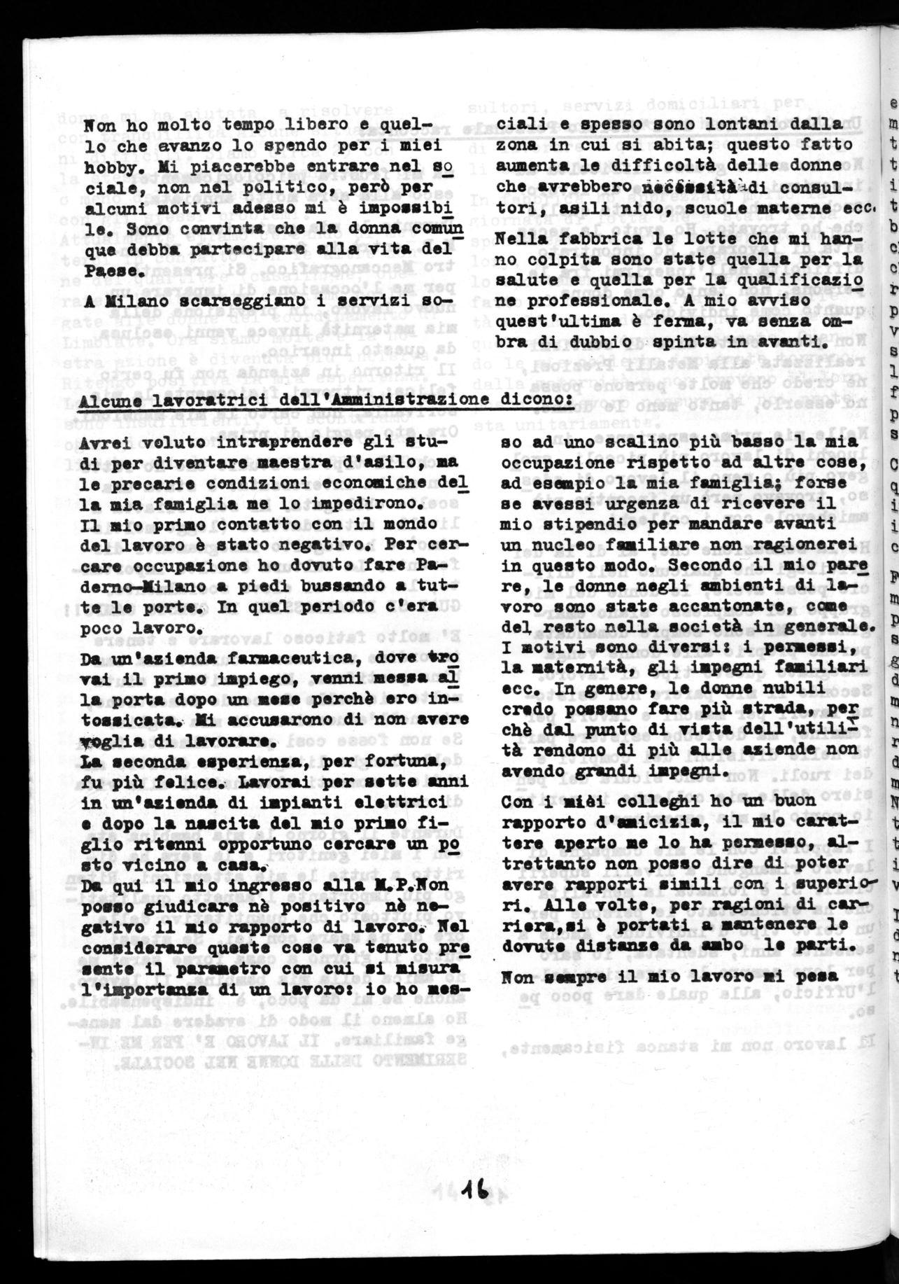 Cominciai a lavorare a 16 anni conti nuando gli studi di ragioneria di.se ra. La mia esperienza durò circa un anno e mezzo . Si trattava di un impiego in un ufficio commerciale. I rapporti con i colleghi erano cordia li. L'aspetto professionale però veniva tralasciato: si facevano un po' tut ti i lavoretti, dal rispondere al telefono, allo scriver al telex. Non avevo quindi una figura professionale ben specifica. Non esistevano in questo 132 sto rapporti con il mondo del lavoro esterno, nè con quello sociale. La nostra giornata era legata unicamente a problemi d'uffici).