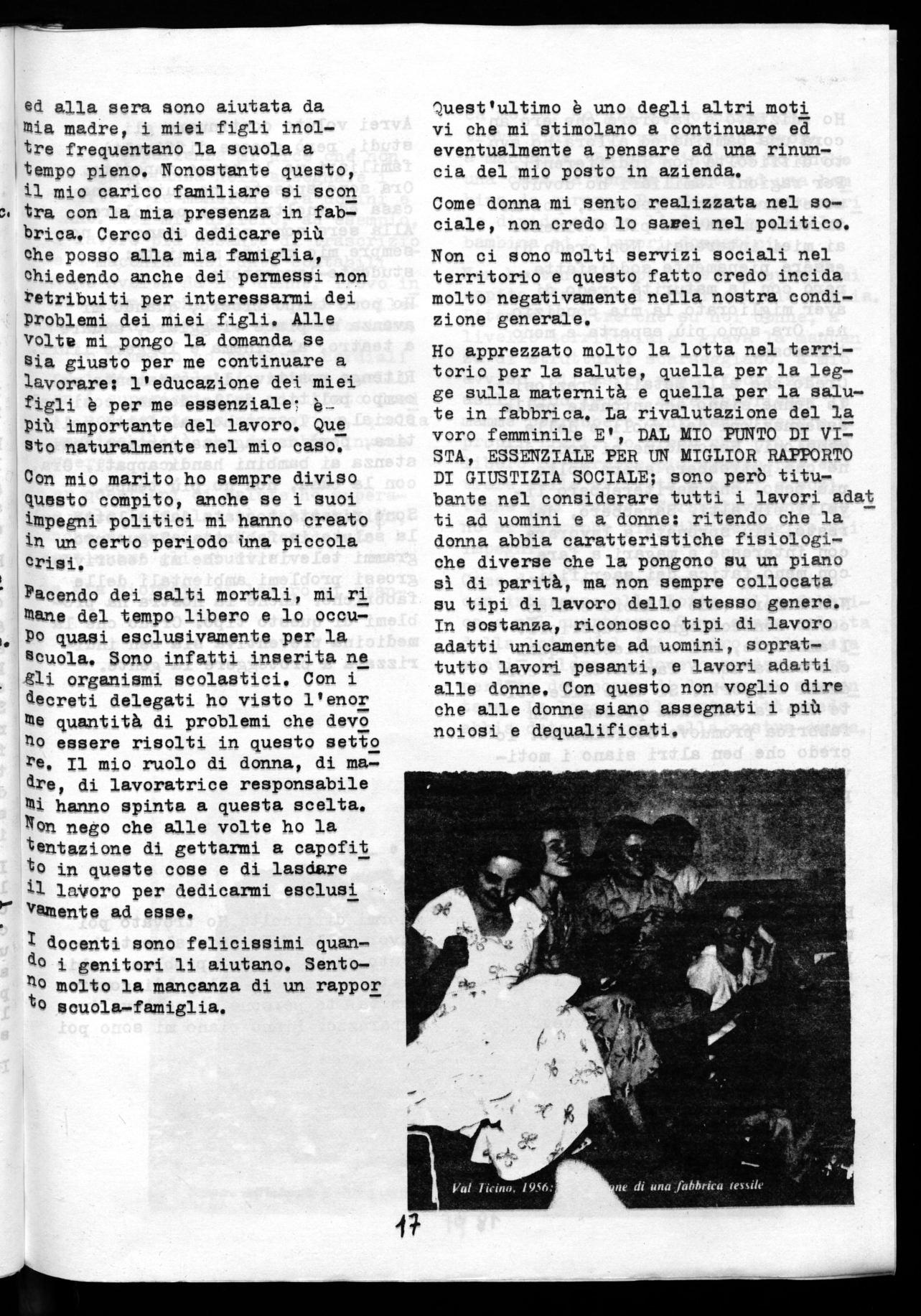 La donna,secondo il mio parere, com prende meglio le condizioni della famiglia, per questo motivo io credo sia giusto che entri nelle strutture sociali e politiche del Paese. Io purtroppo non ho tempo per queste cose; lotto nella fabbrica nella fabbrica e credo che tutte le lotte fatte ci abbiano avvantaggiate; l'in quadramento unico ad esempio ha cam7 biato a mio avviso qualcosa per le donne