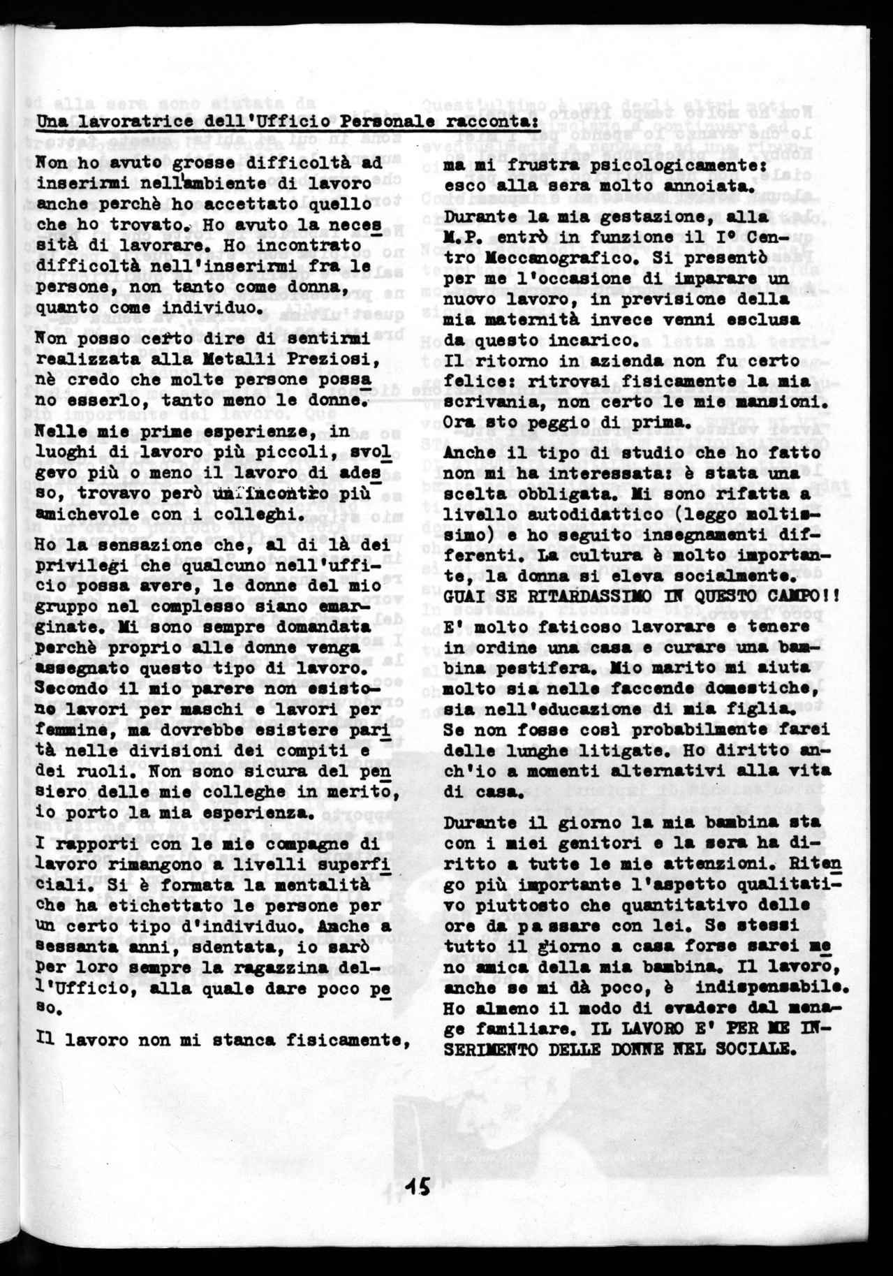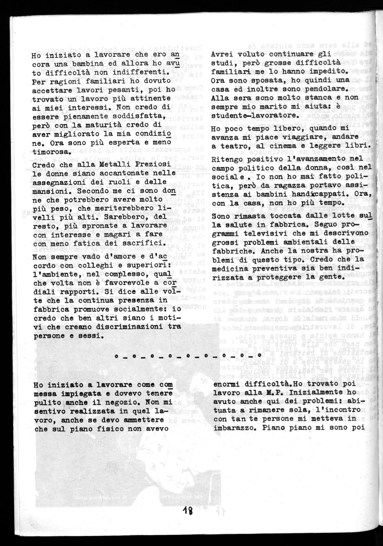 Credo che i miei problemi di madremoglie-lavoratrice accomunino le don ne. Sono convinta che molte soffrano quello che io ho sofferto.Inoltre, cre do che nelle fabbriche a noi donne siano riservate le mansioni più dequalificate. Siamo ritenute inferi() ri. Alla Metalli Preziosi ho discreti rapporti con i miei colleghi e su periori, l'ambiente di lavoro invece, con fumi e rumore, mi è molto ostile.
