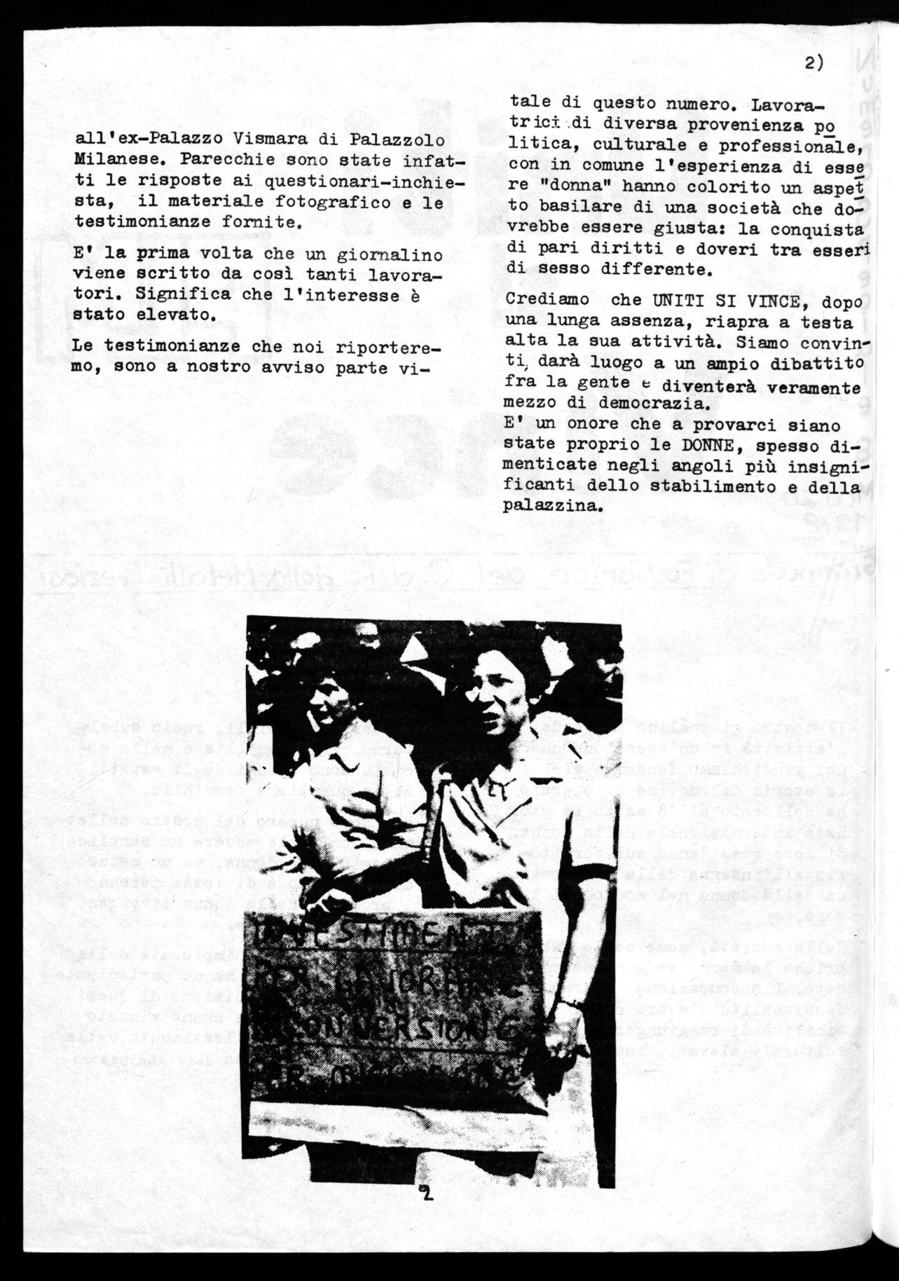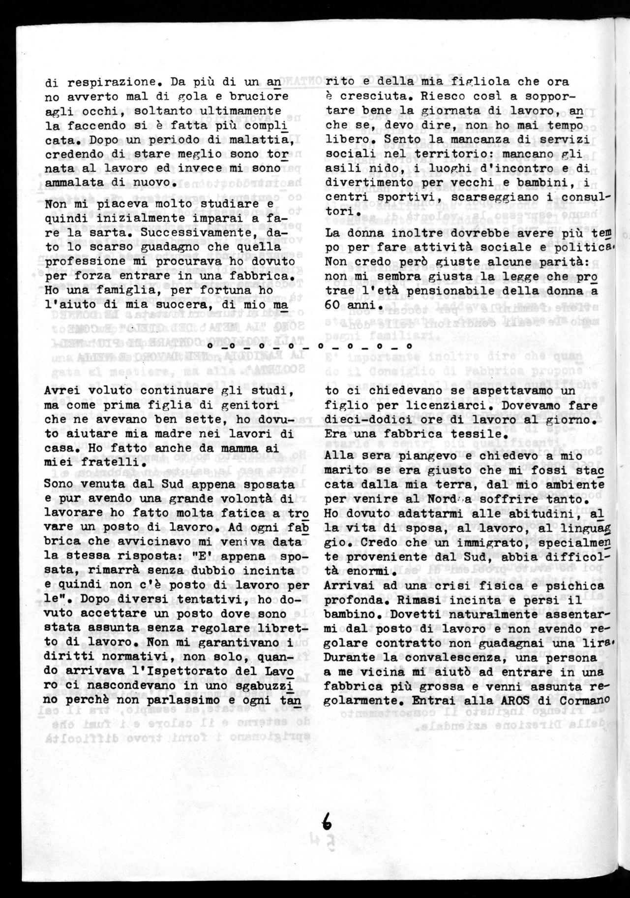 Sono venuta dal Sud appena sposata e pur avendo una grande volontà di lavorare ho fatto molta fatica a tro vare un posto di lavoro. Ad ogni faU brica che avvicinavo mi veniva data la stessa risposta: "E' appena sposata, rimarrà senza dubbio incinta e quindi non c'è posto di lavoro per le". Dopo diversi tentativi, ho dovuto accettare un posto dove sono stata assunta senza regolare libretto di lavoro. Non mi garantivano i diritti normativi, non solo, quando arrivava l'Ispettorato del Lavo ro ci nascondevano in uno sgabuzzi no perchè non parlassimo e ogni tan