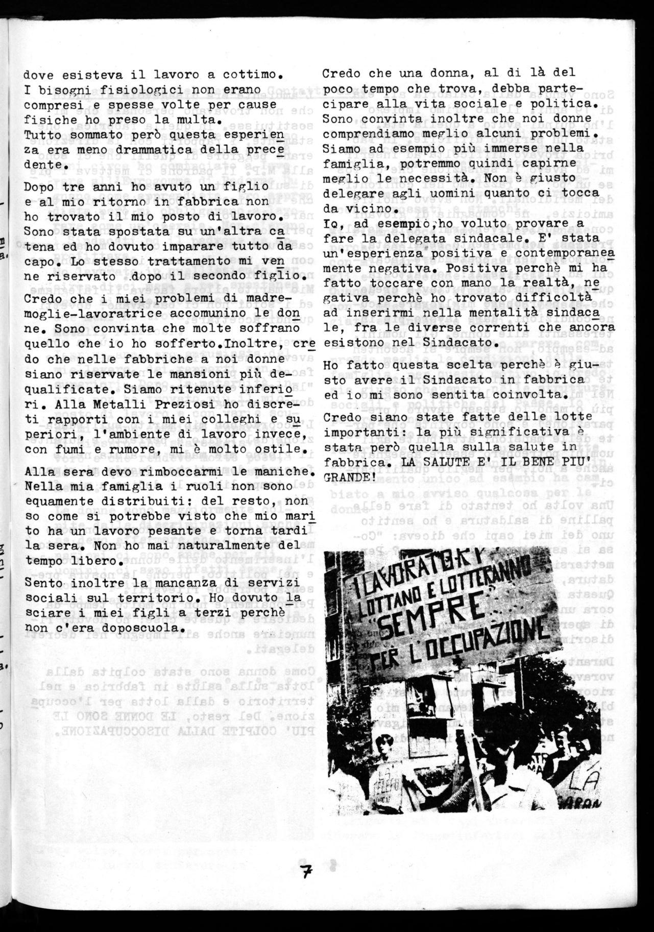 Come donna sono stata colpita dalla lotta sulla salute ín fabbrica e nel territorio e dalla lotta per l'occupa zione. Del resto, LE DONNE SONO LE PIU' COLPITE DALLA DISOCCUPAZIONE.