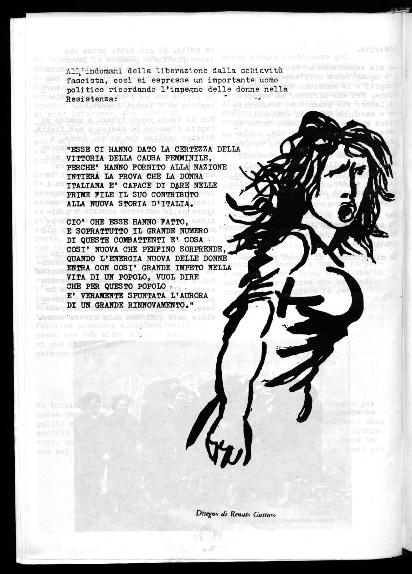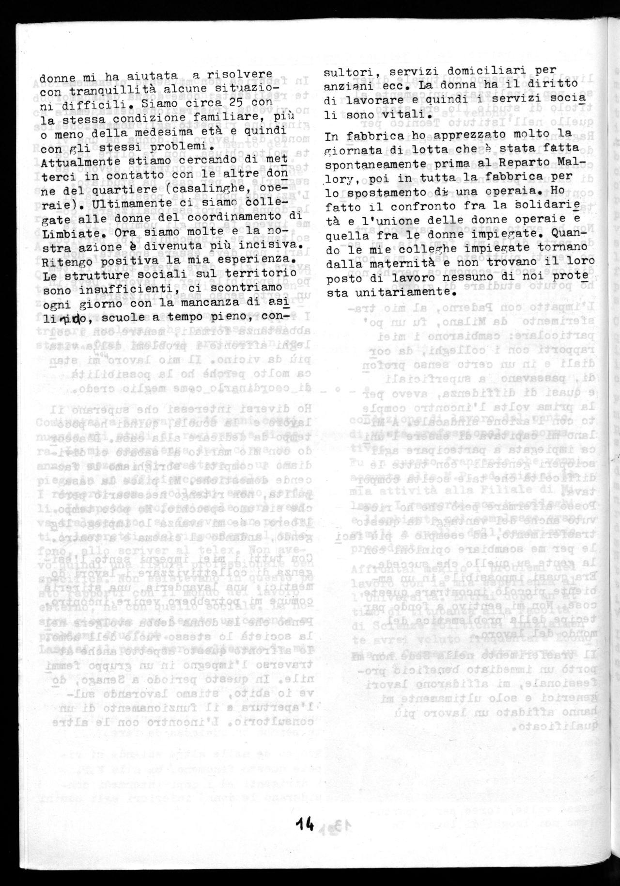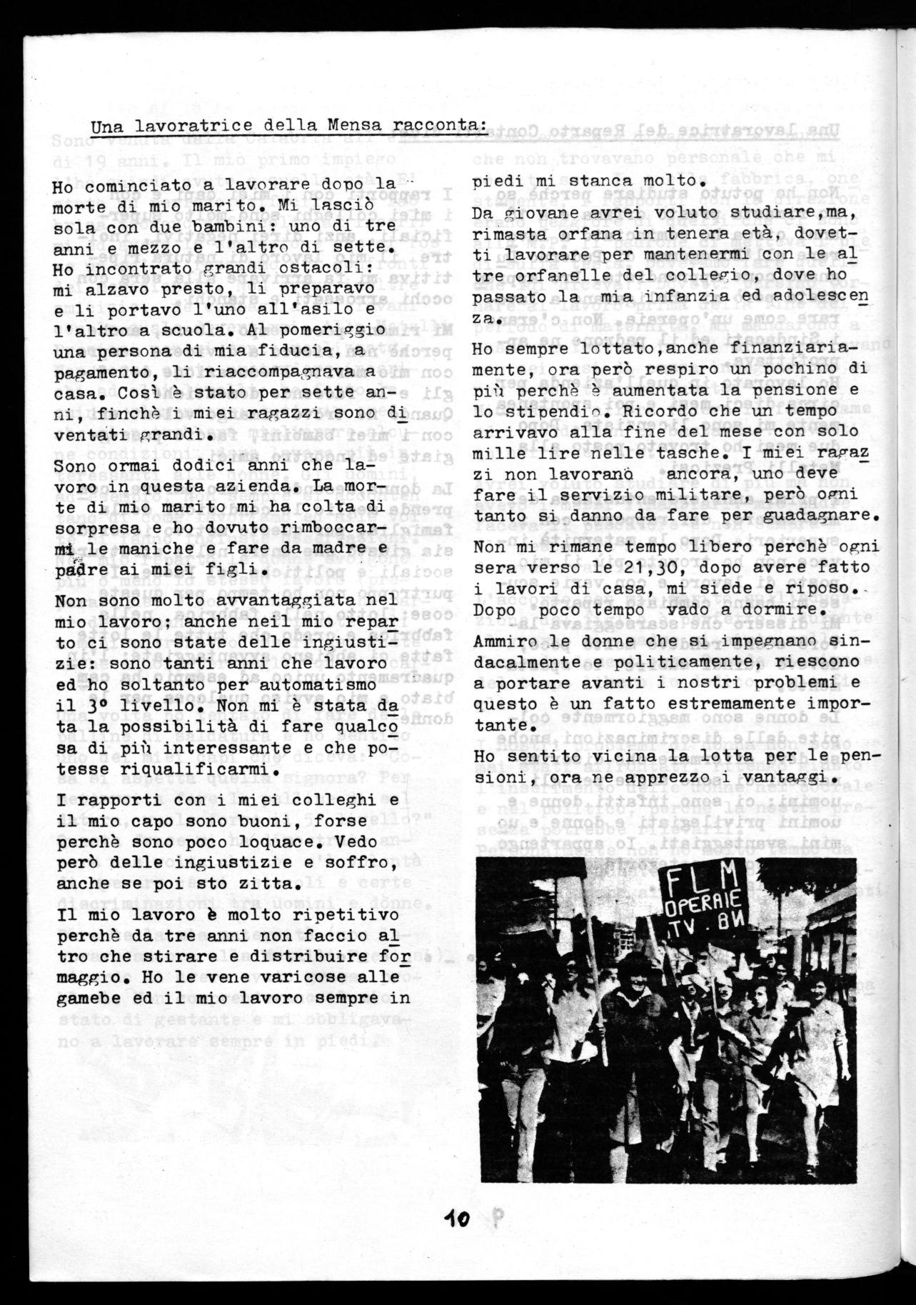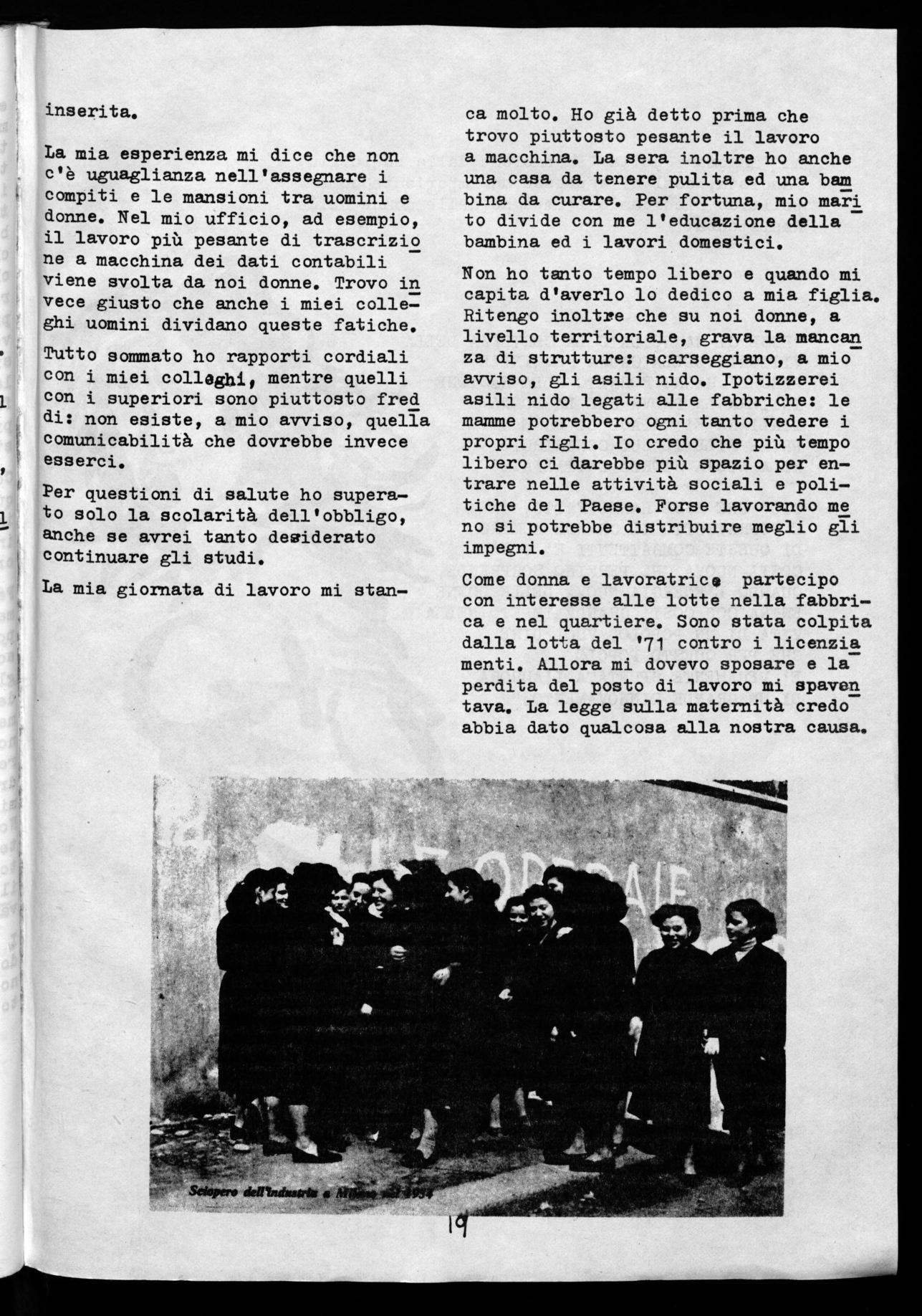 Come donna e lavoratrice partecipo con interesse alle lotte nella fabbrica e nel quartiere. Sono stata colpita dalla lotta del '71 contro i licenzia menti. Allora mi dovevo sposare e la perdita del posto di lavoro mi spaven tava. La legge sulla maternità credo abbia dato qualcosa alla nostra causa.