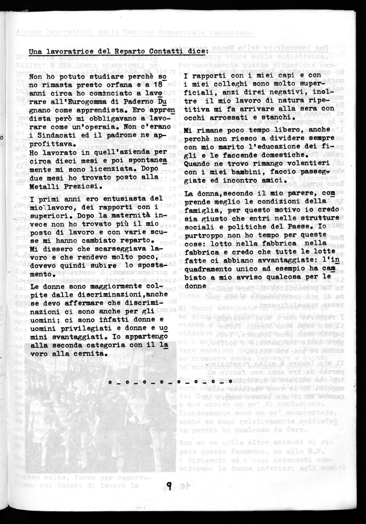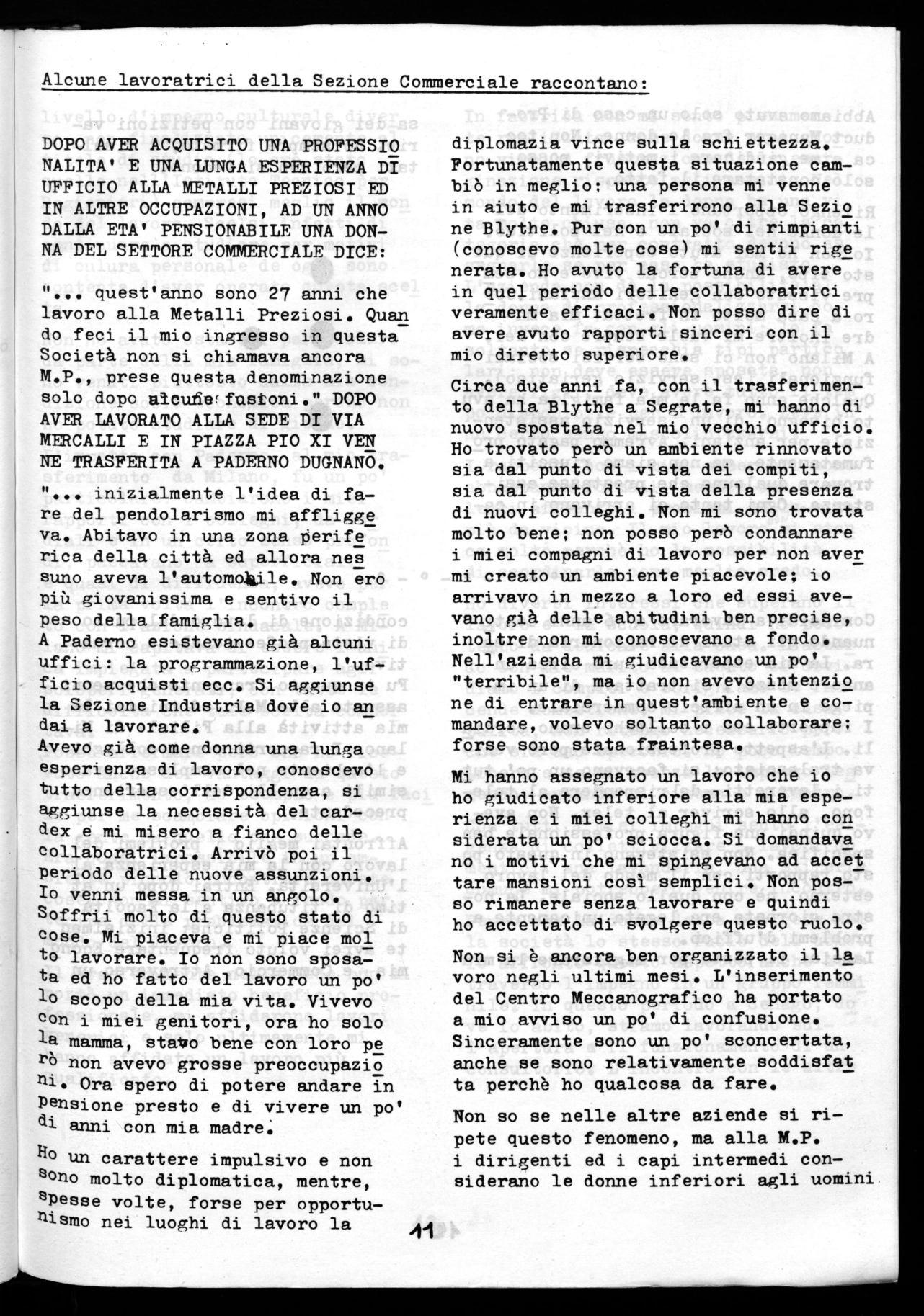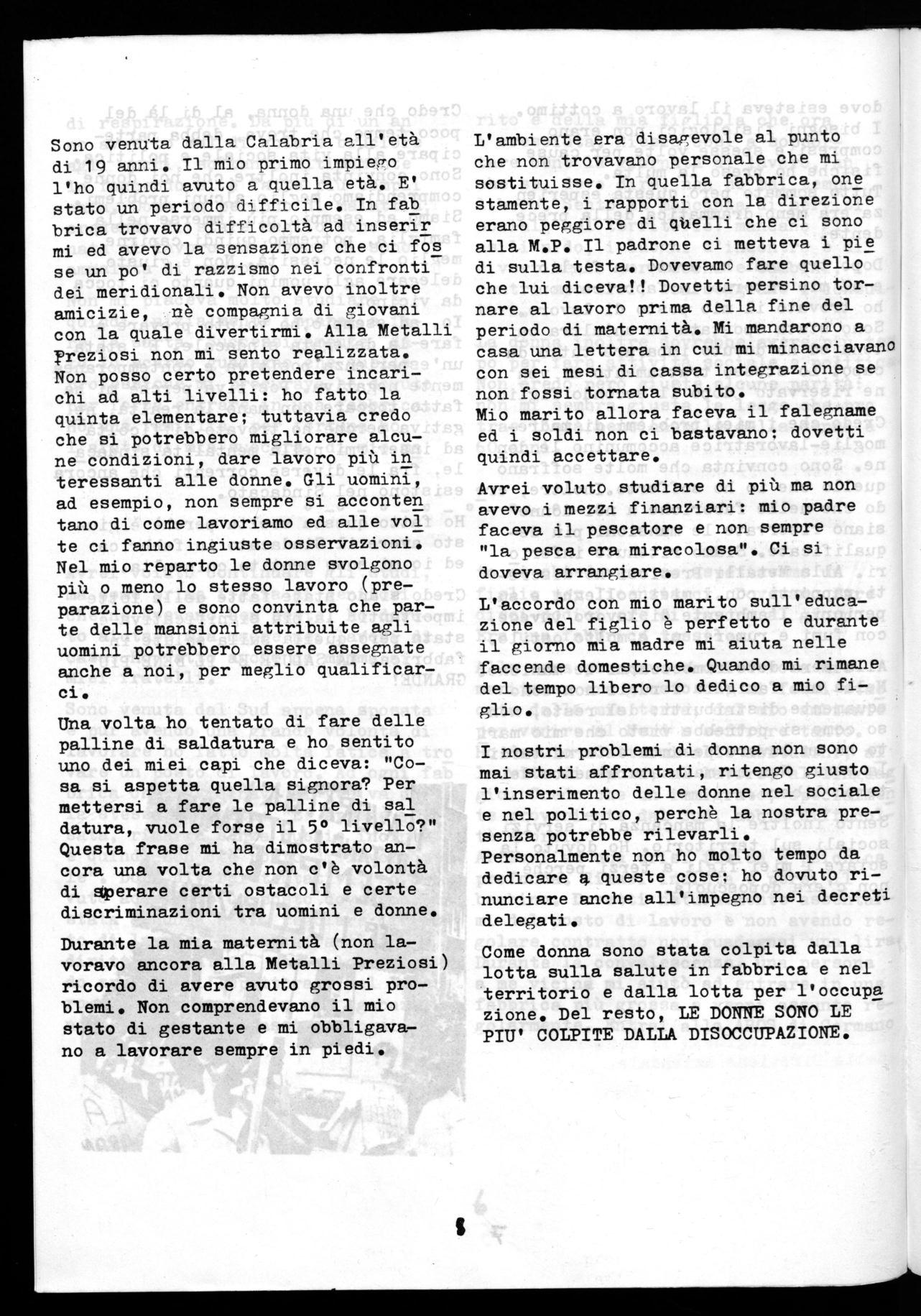 Sono diciassette anni che lavoro e nel 1960 non ho fatto fatica a trovarmi un posto di lavoro. Era il periodo del boom-economico. Ho lavorato per nove anni all'Alluminio di Paderno, ma il salario non bastava ed allorq ho fatto il mio ingresso alla Metalli Preziosi. Pino a poco tempo fa mi trovavo bene, pii ho avuto problemi di salute dovuti all'ambiente di lavoro poco sano ed allora sono stata vittima di una situa zione piuttosto drammatica: mi hanno spostato il posto di lavoro soltanto dopo una lotta alla quale hanno partecipato tutti i lavoratori della M.P. Non mi sarei mai aspettata di venire trattata così male. Mi sembra di ave re fatto sempre il mio dovere e quindi ritengo ingiusto il comportamento della Direzione aziendale.