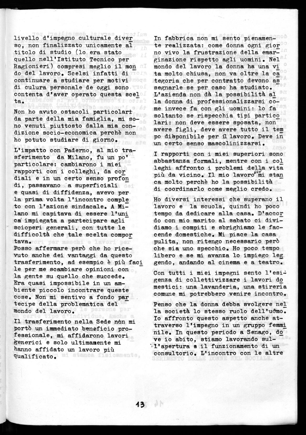 Avevo già come donna una lunga esperienza di lavoro, conoscevo tutto della corrispondenza, si aggiunse la necessità del cardex e mi misero a fianco delle collaboratrici. Arrivò poi il Periodo delle nuove assunzioni. Io venni messa in un angolo. Soffrii molto di questo stato di cose. Mi piaceva e mi piace mol to lavorare. Io non sono sposata ed ho fatto del lavoro un po' lo scopo della mia vita. Vivevo con i miei genitori, ora ho solo la mamma, stavo bene con loro pe rò non avevo grosse preoccupazio ni. Ora spero di potere andare in Pensione presto e di vivere un po' di anni con mia madre.
