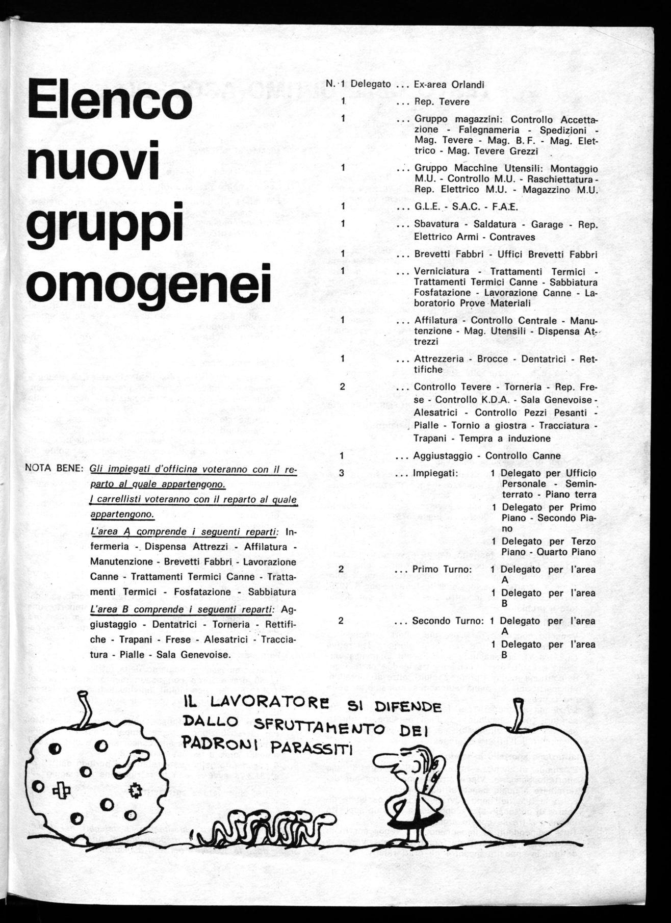 Questa elezione presenta delle novità rispetto alle precedenti, poiché la F.L.M. nella quarta conferenza orgaiiii, zativa ha stabilito delle norme precise per la formazione dei gruppi omogenei e per le modalità nelle elezioni. Per questo motivo, anche in seguito ai molteplici spostamenti di reparti che hanno smembrato alcuni gruppi omogenei, si è reso necessario rivedere e, in alcuni casi, formare nuovi gruppi omogenei e dove questo non è stato possibile, perché non si raggiungeva la numerica necessaria, si sono formate delle aree che aggregano diversi reparti. Questa nuova struttura probabilmente non è priva di difetti e quindi dovrà essere verificata dai lavoratori nel prossimo futuro.