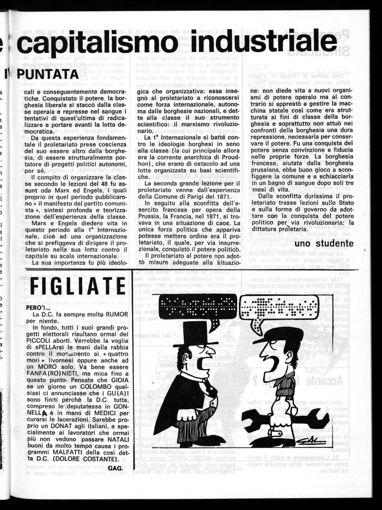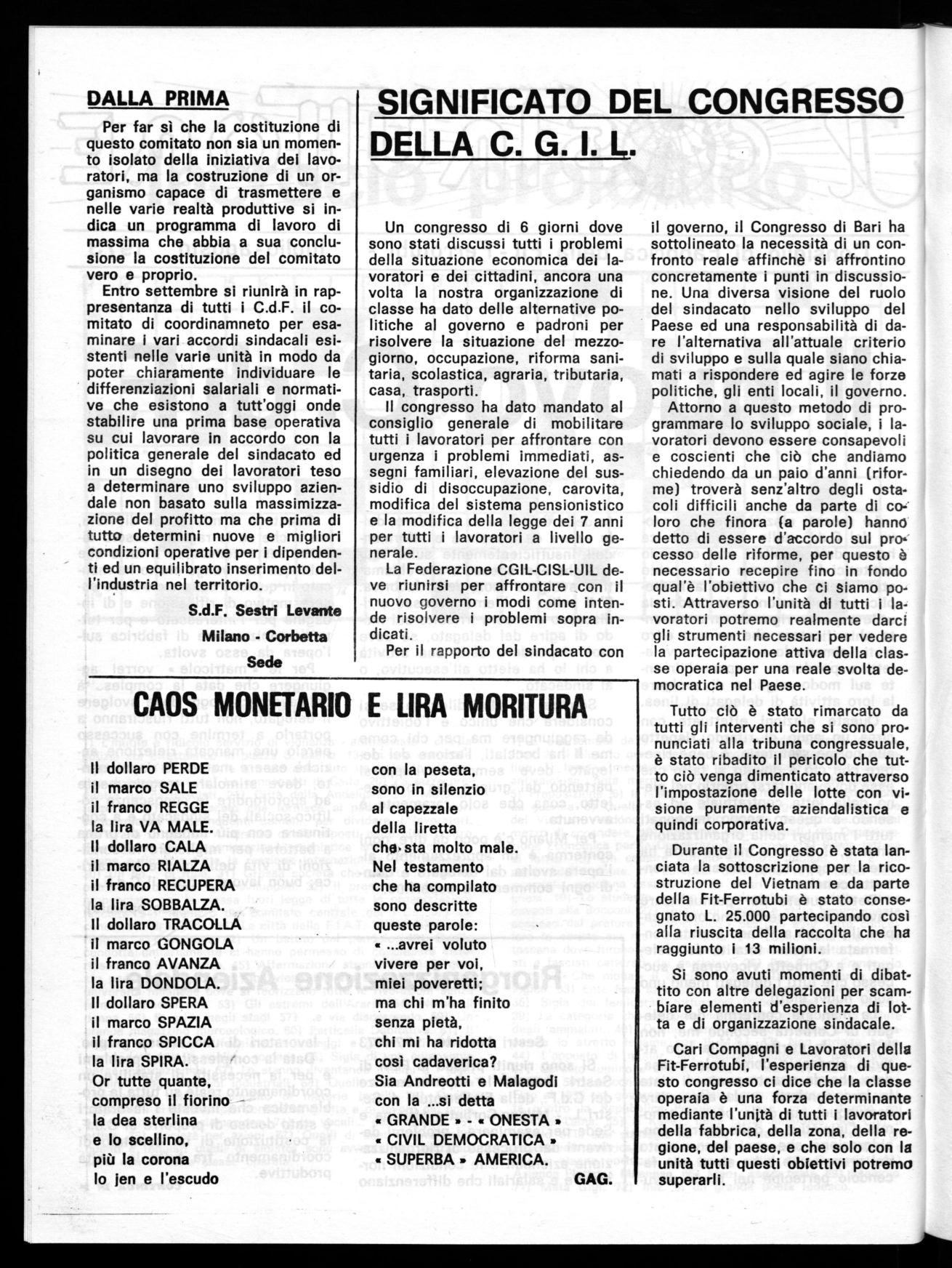 Per concludere, i compagni di Sestri Levante hanno voluto questo incontro non solo per vederci ma per poter sapere qualche cosa in più sul trasferimento in particolare e su altri problemi riguardanti la fabbrica. Si è deciso per avere un reale contatto sia d'iniziativa che di lotta, di formare un comitato coordinatore che vagli tutte le diversità esistenti fra i nostri complessi industriali e prepari un'azione unitaria affinchè qualsiasi problema non interessi solamente questo o quello ma venga condotto da tutti i lavoratori della Fit-Ferrotubi.