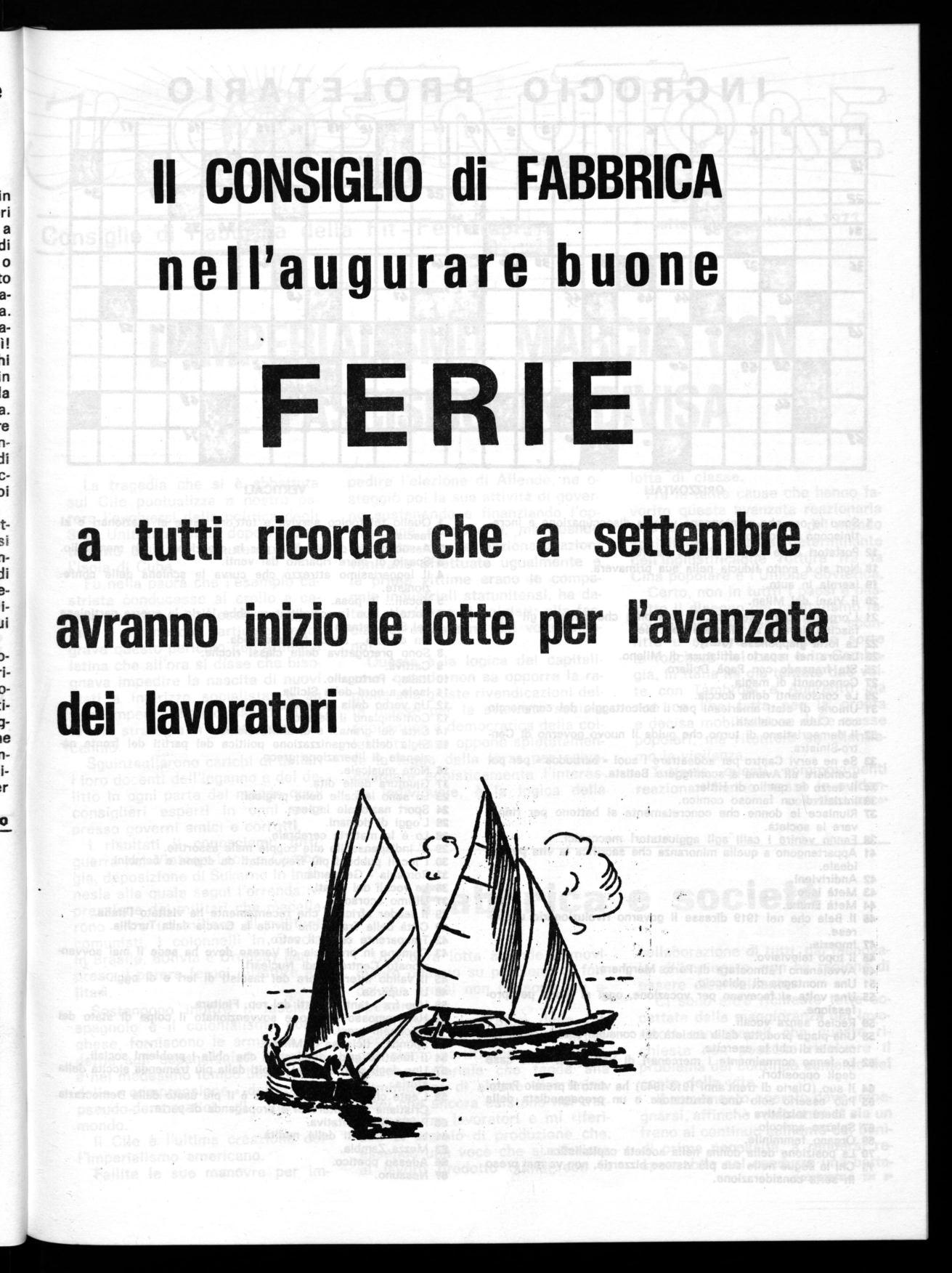 Entro settembre si riunirà in rappresentanza di tutti i C.d.F. il comitato di coordinamneto per esaminare i vari accordi sindacali esistenti nelle varie unità in modo da poter chiaramente individuare le differenziazioni salariali e normative che esistono a tutt'oggi onde stabilire una prima base operativa su cui lavorare in accordo con la politica generale del sindacato ed in un disegno dei lavoratori teso a determinare uno sviluppo aziendale non basato sulla massimizzazione del profitto ma che prima di tutto determini nuove e migliori condizioni operative per i dipendenti ed un equilibrato inserimento dell'industria nel territorio.
