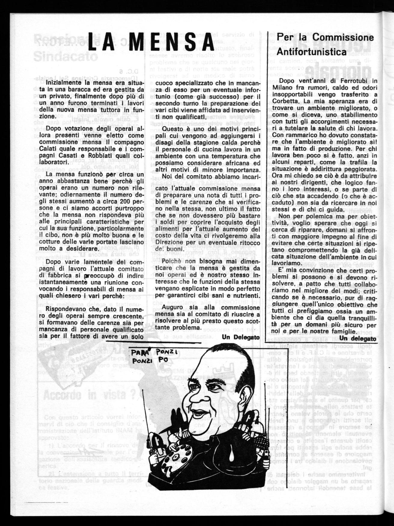Questo è uno dei motivi principali cui vengono ad aggiungersi i disagi della stagione calda perchè il personale di cucina lavora in un ambiente con una temperatura che possiamo considerare africana ed altri motivi di minore importanza. Noi del comitato abbiamo incaricato l'attuale commissione mensa di preparare una nota di tutti i problemi e le carenze che si verificano nella stessa, non ultimo il fatto che se non dovessero più bastare i soldi per coprire l'acquisto degli alimenti per l'attuale aumento del costo della vita ci rivolgeremo alla Direzione per un eventuale ritocco de: buoni.