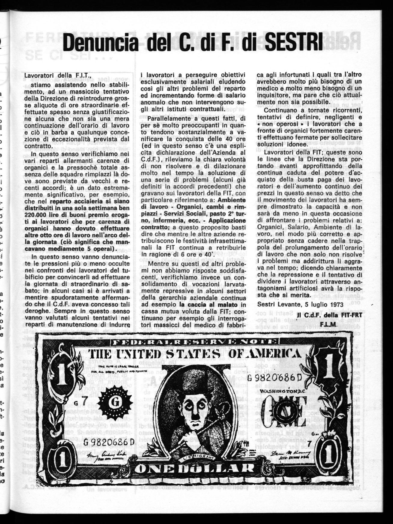 L'11 luglio 1973 si sono riuniti presso la FLM di Sestri Levante i rappresentanti della C.d.F. di Milano, Corbetta, Sestri Levante e Sede, per un esame generale delle condizioni salariali e normative.