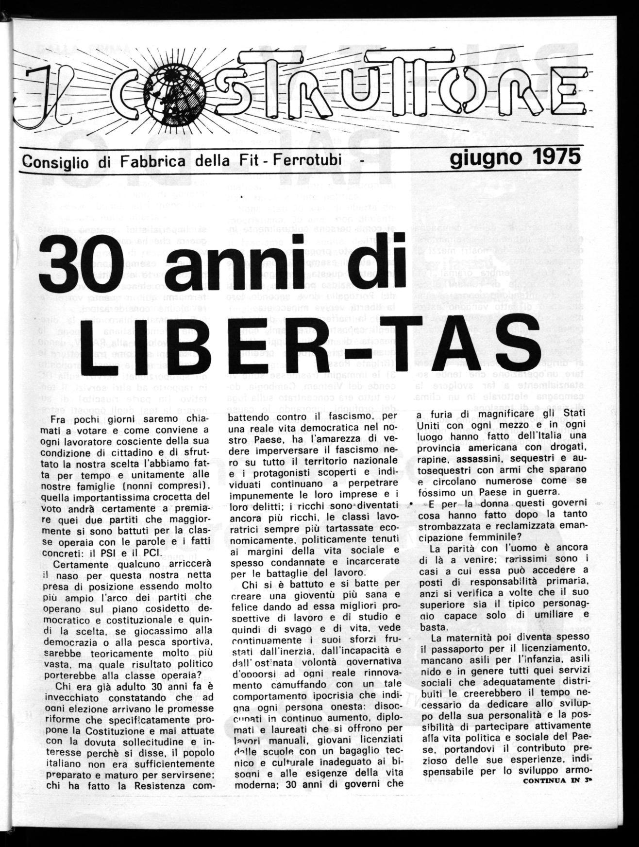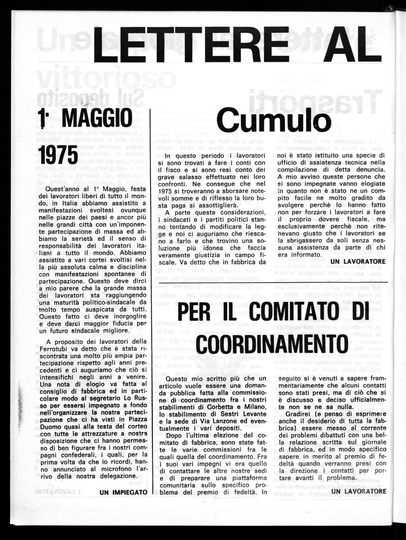 A proposito dei lavoratori della Ferrotubi va detto che è stata riscontrata una molto più ampia partecipazione rispetto agli anni precedenti e ci auguriamo che ciò si intensifichi negli anni a venire. Una nota di elogio va fatta al consiglio di fabbrica ed in particolare modo al segretario Lo Russo per essersi impegnato a fondo nell'organizzare la nostra partecipazione che ci ha visti in Piazza Duomo quasi alla testa del corteo con tutte le attrezzature a nostra disposizione che ci hanno permesso di ben figurare fra i nostri compagni confederali, i quali, per la prima volta da che io ricordi, hanno annunciato al microfono l'arrivo della nostra delegazione.