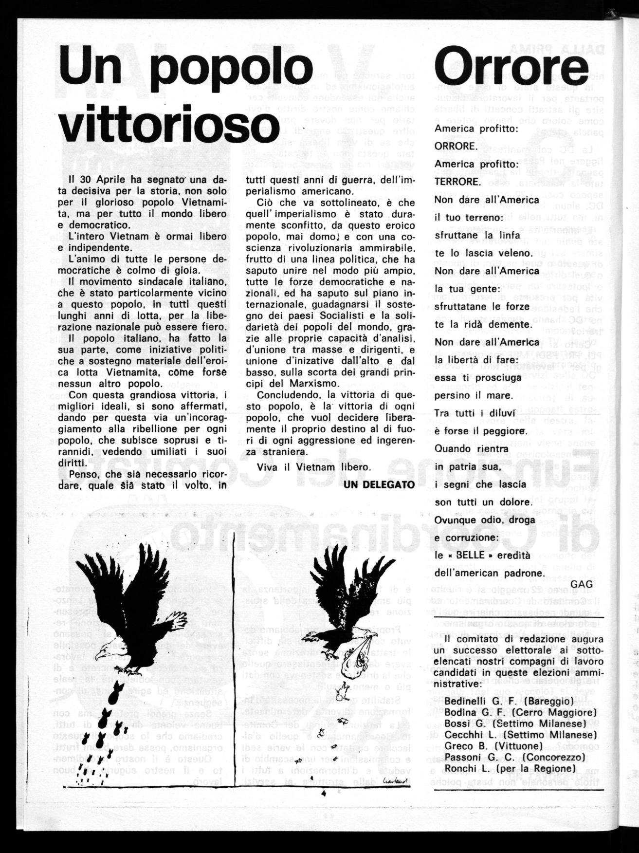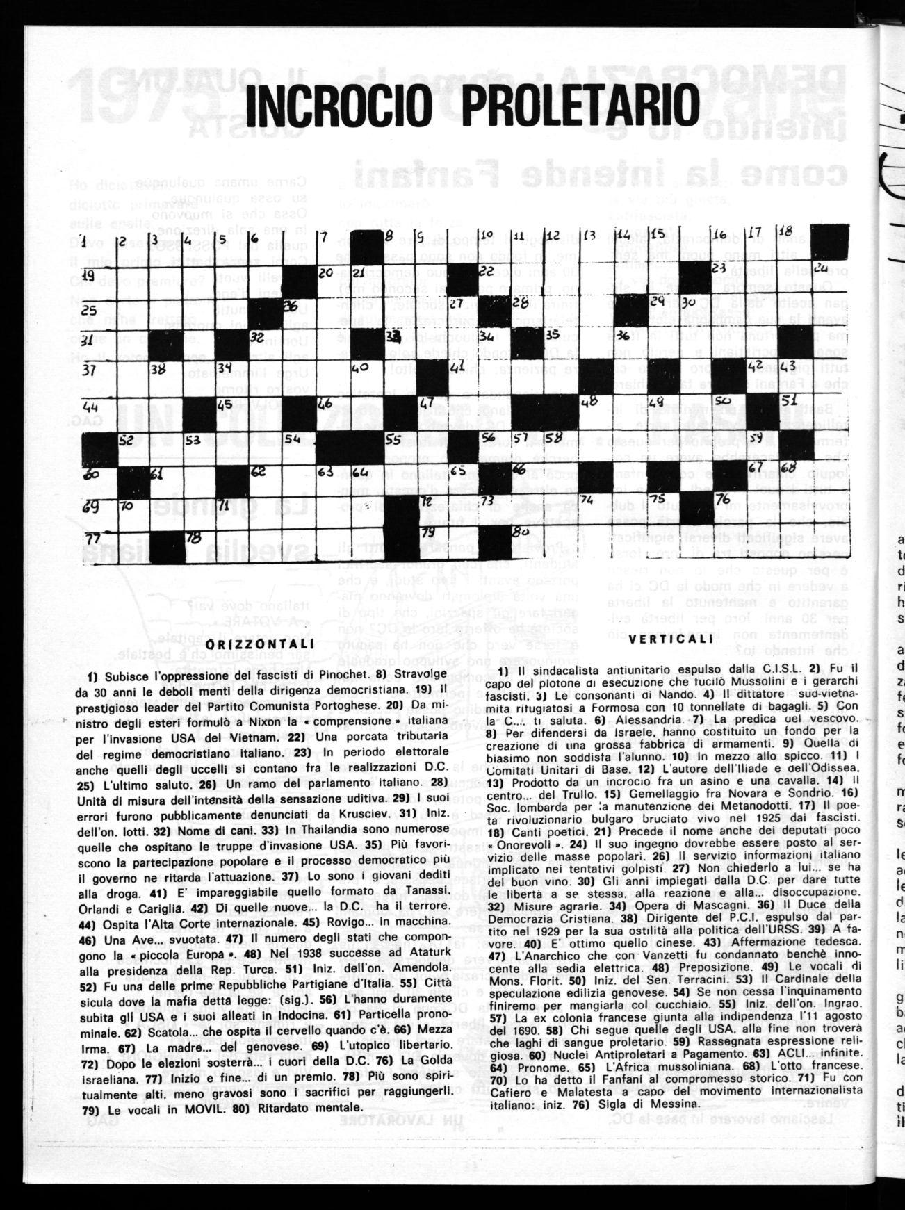 1) Il sindacalista antiunitario espulso dalla C.I.S.L. 2) Fu il capo del plotone di esecuzione che tucilò Mussolini e i gerarchi fascisti. 3) Le consonanti di Nando. 4) Il dittatore suci-vietnamita ritugiatosi a Formosa con 10 tonnellate di bagagli. 5) Con la C.... ti saluta. 6) Alessandria. 7) La predica uel vescovo. 8) Per difendersi da Israele, hanno costituito un fondo per la creazione di una grossa fabbrica di armamenti. 9) Quella di biasimo non soddista l'alunno. 10) In mezzo allo spicco. 11) I Uomitati Unitari di Base. 12) L'autore dell'Iliade e dell'Odissea. 13) Prodotto da un incrocio fra un asino e una cavalla, 14) II centro... del Trullo. 15) Gemellaggio fra Novara e Sondrio. 16) Soc. lombarda per :a manutenzione dei Metanodotti. 17) Il poeta rivoluzionario bulgaro bruciato vivo nel 1925 dai fascisti. 18) Canti poetici. 21) Precede il nome anche dei deputati poco Onorevoli ». 24) Il suo ingegno dovrebbe essere posto al servizio delle masse popolari. 26) Il servizio informazioni italiano implicato nei tentativi golpisti. 27) Non chiederlo a se ha del buon vino. 30) Gli anni impiegati dalla D.C. per dare tutte le libertà a se stessa, alla reazione e alla... disoccupazione. 32) Misure agrarie. 34) Opera di Mascagni. 36) Il Duce della Democrazia Cristiana. 38) Dirigente del P.C.I. espulso dal partito nel 1929 per la sua ostilità alla politica dell'URSS. 39) A favore. 40) E' ottimo quello cinese. 43) Affermazione tedesca. 47) L'Anarchico che con Vanzetti fu condannato benchè innocente alla sedia elettrica. 48) Preposizione. 49) Le vocali di Mons. Florit. 50) Iniz. del Sen. Terracini. 53) Il Cardinale della speculazione edilizia genovese. 54) Se non cessa l'inquinamento finiremo per mangiarla col cucchiaio. 55) Iniz. dell'on. Ingrao. 57) La ex colonia francese giunta alla indipendenza 1'11 agosto del 1690. 58) Chi segue quelle degli USA, alla fine non troverà che laghi di sangue proletario. 59) Rassegnata espressione religiosa. 60) Nuclei Antiproletari a Pagamento. 63) ACLI... infinite. 64) Pronome. 65) L'Africa mussoliniana. 68) L'otto francese. 70) Lo ha detto il Fanfani al compromesso storico. 71) Fu con Cafiero e Malatesta a capo del movimento internazionalista italiano: iniz. 76) Sigla di Messina.
