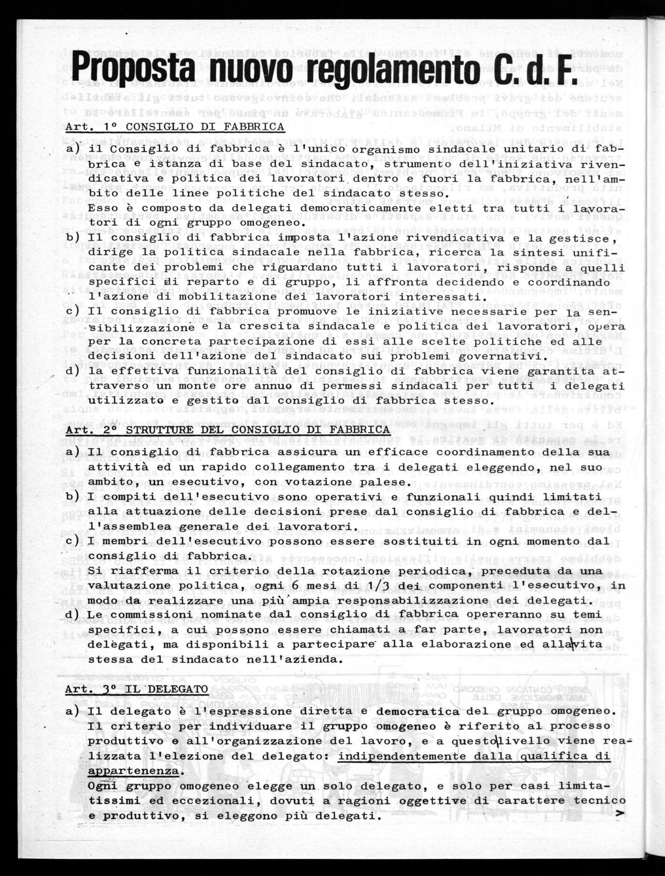 Il consiglio di fabbrica promuove le iniziative necessarie per la sen'sibilizzazioné e la crescita sindacale e politica dei lavoratori, opera per la concreta partecipazione di essi alle scelte politiche ed alle decisioni dell'azione del sindacato sui problemi governativi.