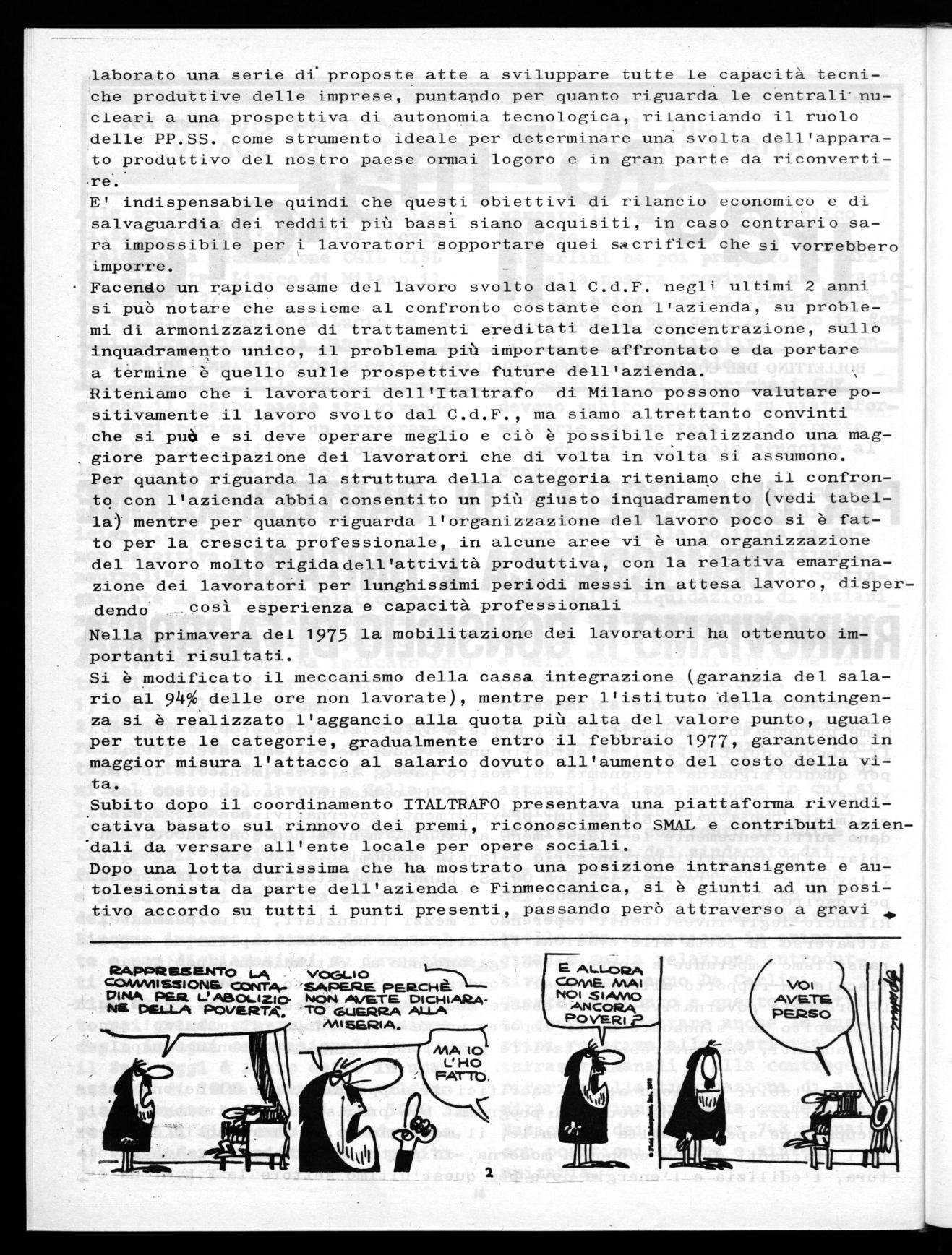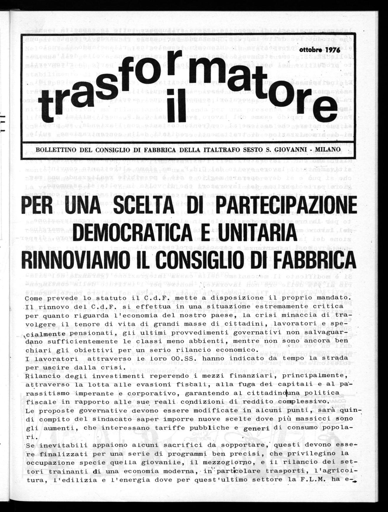 Riteniamo che i lavoratori dell'Italtrafo di Milano possono valutare positivamente il lavoro svolto dal C.d.F., ma siamo altrettanto convinti che si può e si deve operare meglio e ciò è possibile realizzando una maggiore partecipazione dei lavoratori che di volta in volta si assumono.