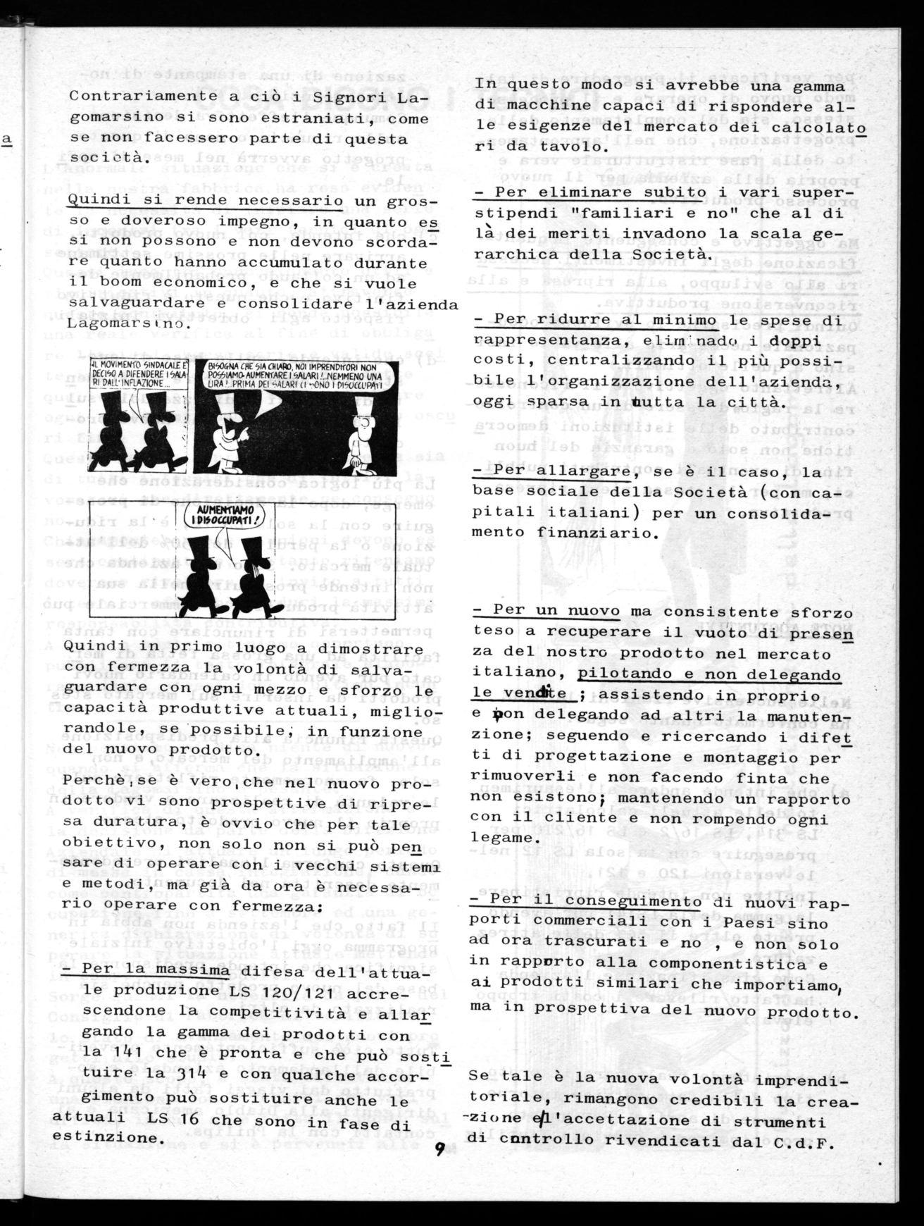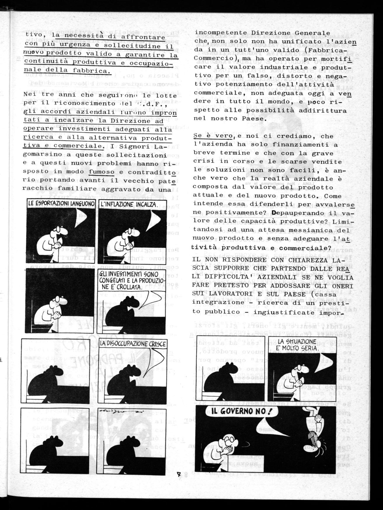 Nei tre anni che seguirono le lotte per il riconoscimento del gli accordi aziendali Furono impron tati a incalzare la Direzione ad operare investimenti adeguati alla ricerca e alla alternativa produttiva e commerciale. I Signori Lagomarsino a queste sollecitazioni e a questi nuovi problemi hanno risposto in modo fumoso e contraditto rio portando avanti il vecchio pate racchio familiare aggravato da una