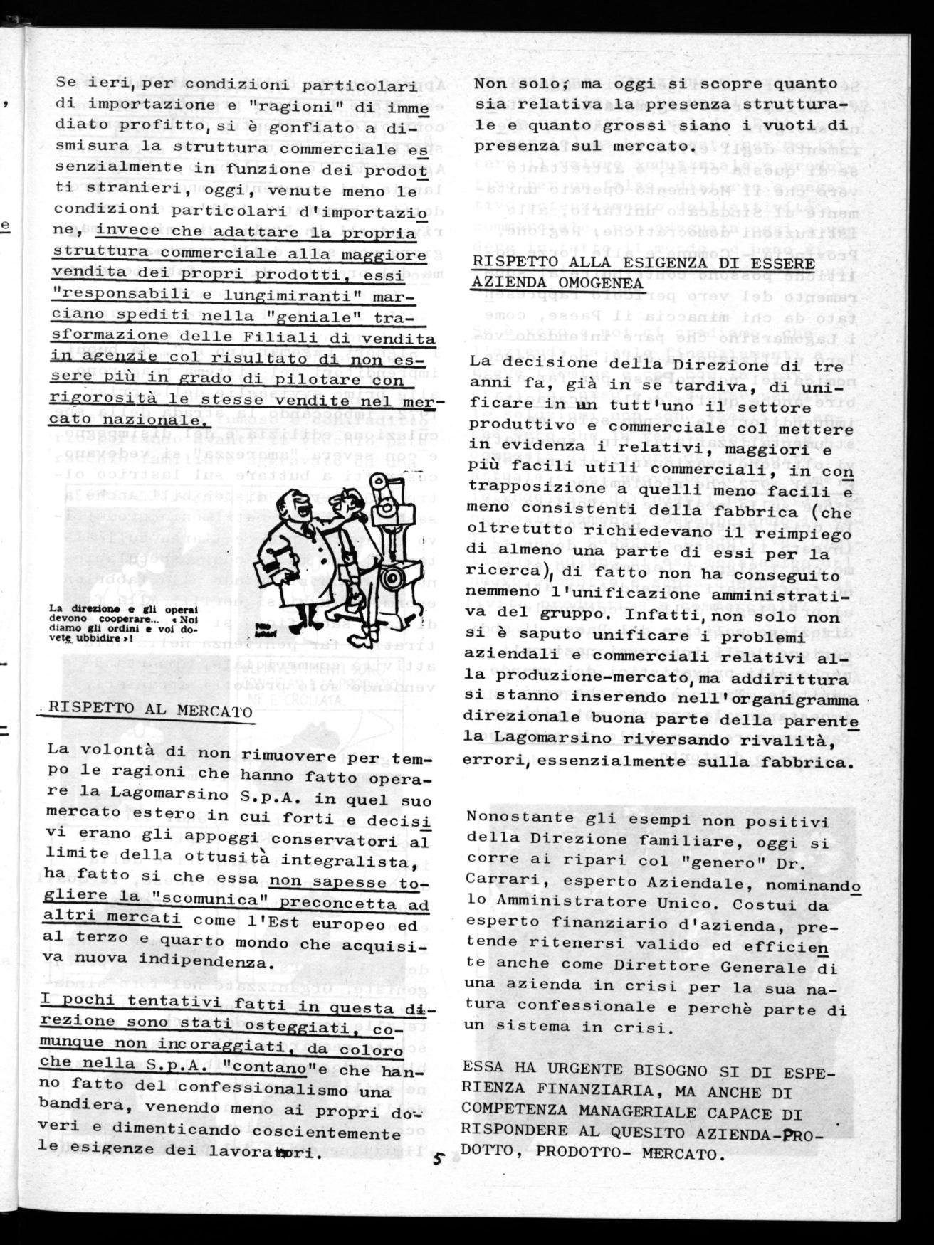 L'acutizzarsi della tipica crisi politico-economica del nostro Paese di .cui i "Sigg. Lagomarsino", quali imprenditori del sistema contribuire no alla crescita di un modello di sviluppo distorto con produrre beni di consumo durevoli essenzialmente per l'esportazione in mercati coloniali o semi coloniali, contemporanea mente gonfiando a dismisura l'attività terziaria commerciale con l'importazione e la commercializzazione di pro dotti esteri, subisce di fatto, col proprio e voluto relativo sviluppo tecnologico,la incapacità di essere competititiva sul mercato, fatto d'altronde comune alle nostre poco lungimiranti industrie di trasformazione.