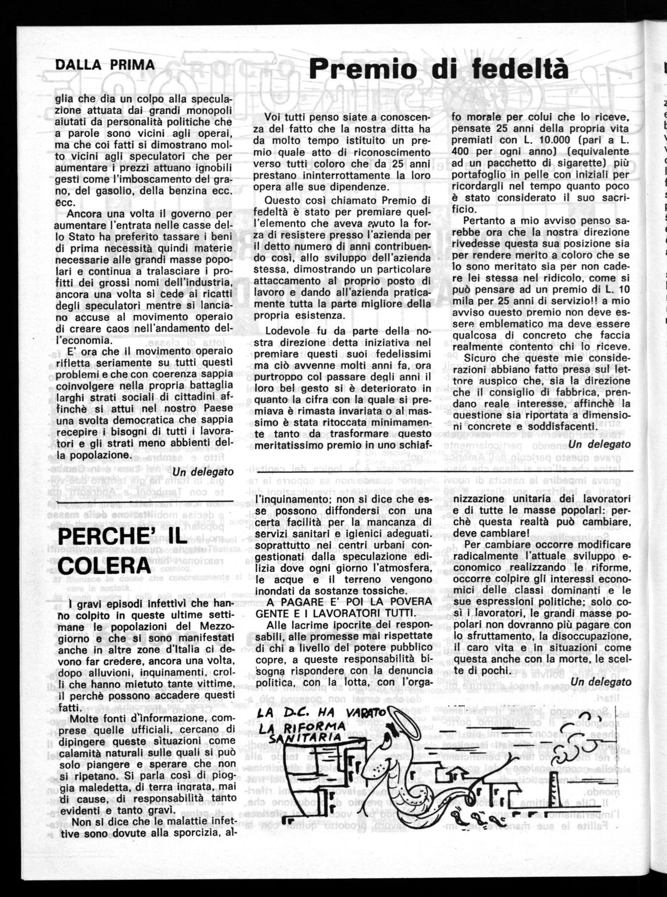 Pertanto a mio avviso penso sarebbe ora che la nostra direzione rivedesse questa sua posizione sia per rendere merito a coloro che se lo sono meritato sia per non cadere lei stessa nel ridicolo, come si può pensare ad un premio di L. 10 mila per 25 anni di servizio!! a mio avviso Questo premio non deve essere emblematico ma deve essere qualcosa di concreto che faccia realmente contento chi lo riceve. Sicuro che queste mie considerazioni abbiano fatto presa sul lettore auspico che, sia la direzione che il consiglio di fabbrica, prendano reale interesse, affinchè la questione sia riportata a dimensioni concrete e soddisfacenti.