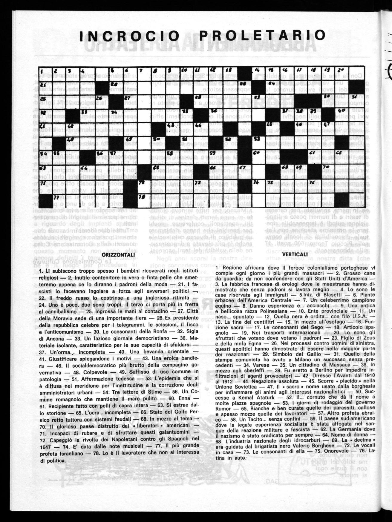 3. La fabbrica francese di orologi dove le maestranze hanno dimostrato che senza padroni si lavora meglio - 4. Lo sono le case riservate agli immigrati - 5.Iniz. di Blasetti - 6. Piante erbacee dell'America Centrale - 7. Un celeberrimo campione equino - 8. Danno esperienza e... acciacchi - 9. Una antica bellicosa razza Polinesiana - 10. Ente provinciale - 11. Un naso... spuntato - 12 Quella nera è ordita... con filo U.S.A.13. La fine dei centilitri - 15. In mezzo all'esofago - 16. Funzione sacra - 17. Le consonanti del Sego - 18. Articolo spagnolo - 19. Nei trasporti internazionali - 20. Lo sono gli sfruttati che votano dove votano i padroni - 23. Figlio di Zeus della ninfa Egina - 26. Nei processi contro uomini di sinistra, questi apolitici hanno dimostrato di essere nella maggior parte dei reazionari - 29. Simbolo del Gallio - 31. Quello della stampa comunista ha avuto a Milano un successo senza precedenti - 34. Varese - 35. Un cittadino di Massaua - 38. In mezzo agli sberleffi - 39. Fu eretto a Berlino per impedire infiltrazioni di agenti provocatori - 42 Diresse l'Avanti dal 1910 al 1912 - 44. Negazione assoluta - 45. Scorre « placido • nella Unione Sovietica - 47. Il • sacro • nome usato dalla borghesia per infiammare gli animi agli interessi nazionalistici - 50. Successe a Kemal Ataturk - 52. Il_ cornuto che dà il nome a molte piazze spagnole - 53. I giorni di rodaggio del governo Rumor - 55. Bianche e ben curate quelle dei parassiti, callose spesso mozze quelle dei lavoratori - 57. Altro profeta ebraico - 58. Un Tacito... senza confini - 59. Il paese sud-americano dove la legale esperienza socialista è stata affogata nel sangue della reazione militare e fascista - 62. La Germania dove il nazismo è stato sradicato per sempre - 64. Nome di donna68 L'industria nazionale degli idrocarburi - 69. La • decima era guidata dal brigatista nero Valerio Borghese - 72. Le vocali in casa - 73. Le consonanti di ella - 75. Onorevole - 76. Lati-tu in auto.