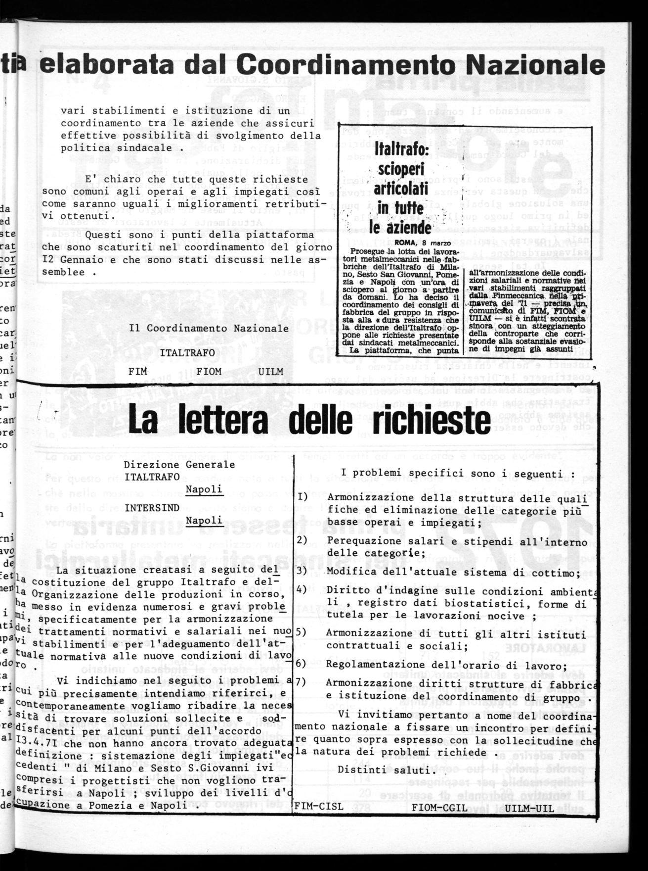 Il Coordinamento Nazionale della Italtrafo riunitosi a Roma il 7 Marzo , di fronte alla dura resistenza che la Direzione oppone alle richieste presenta te (discusse nel corso delle trattative svoltesi all'Intersind di Napoli l'II e 22 Febbraio scorso ) ha deciso di continuare la lotta iniziata dopo la rot tura delle trattative con 5 ore di sciopero alla settimana in tutti e quattro gli stabilimenti del gruppo : Milano, Sesto , Napoli e Pomezia .