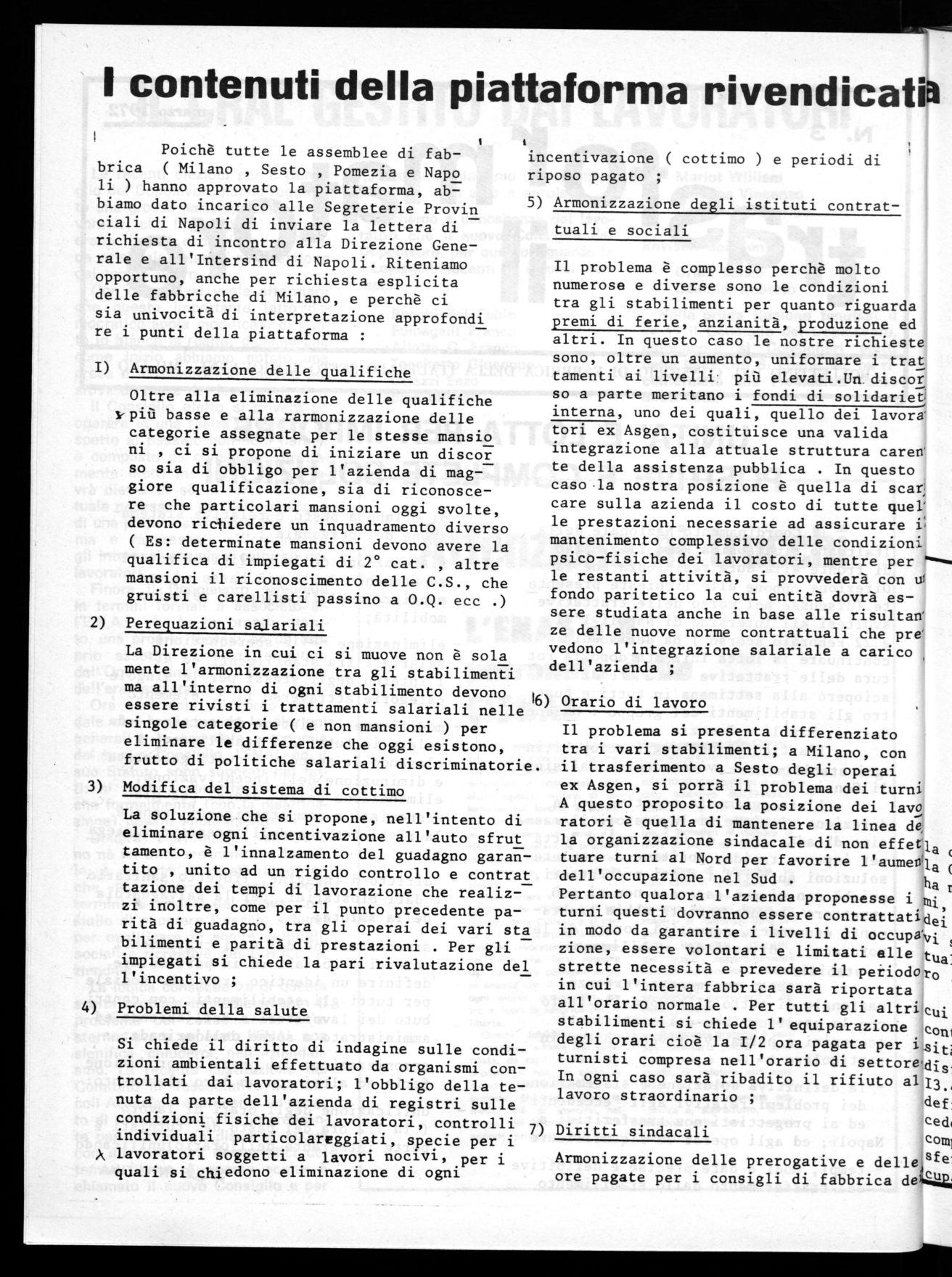 Poiché tutte le assemblee di fabbrica ( Milano , Sesto , Pomezia e Napo li ) hanno approvato la piattaforma, abbiamo dato incarico alle Segreterie Provin cieli di Napoli di inviare la lettera di richiesta di incontro alla Direzione Generale e all'Intersind di Napoli. Riteniamo opportuno, anche per richiesta esplicita delle fabbricche di Milano, e perchè ci sia univocità di interpretazione approfondi re i punti della piattaforma :