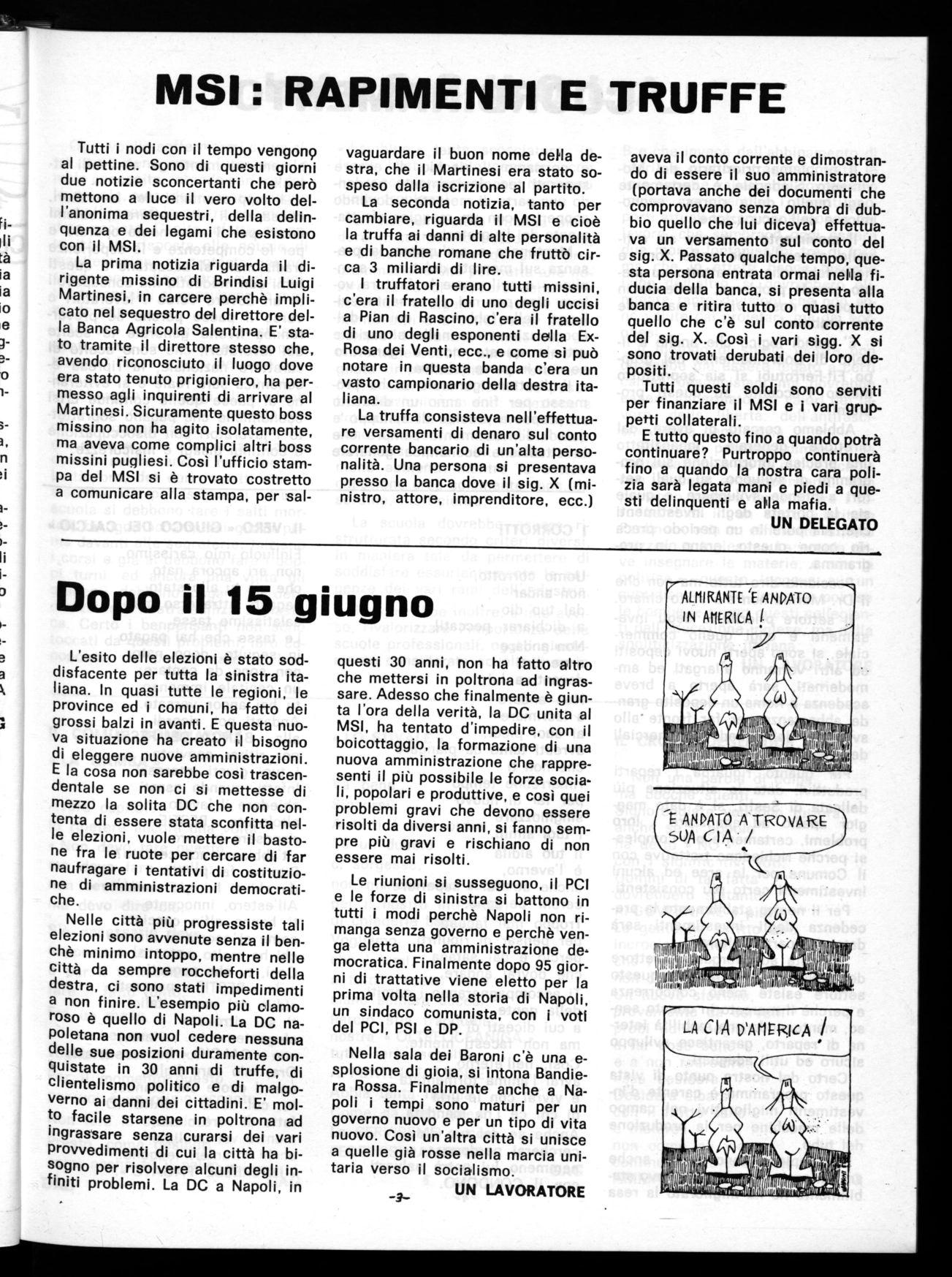 La prima notizia riguarda il dirigente missino di Brindisi Luigi Martinesi, in carcere perchè implicato nel sequestro del direttore della Banca Agricola Salentina. E' stato tramite il direttore stesso che, avendo riconosciuto il luogo dove era stato tenuto prigioniero, ha permesso agli inquirenti di arrivare al Martinesi. Sicuramente questo boss missino non ha agito isolatamente, ma aveva come complici altri boss missini pugliesi. Così l'ufficio stampa del MSI si è trovato costretto a comunicare alla stampa, per sal-