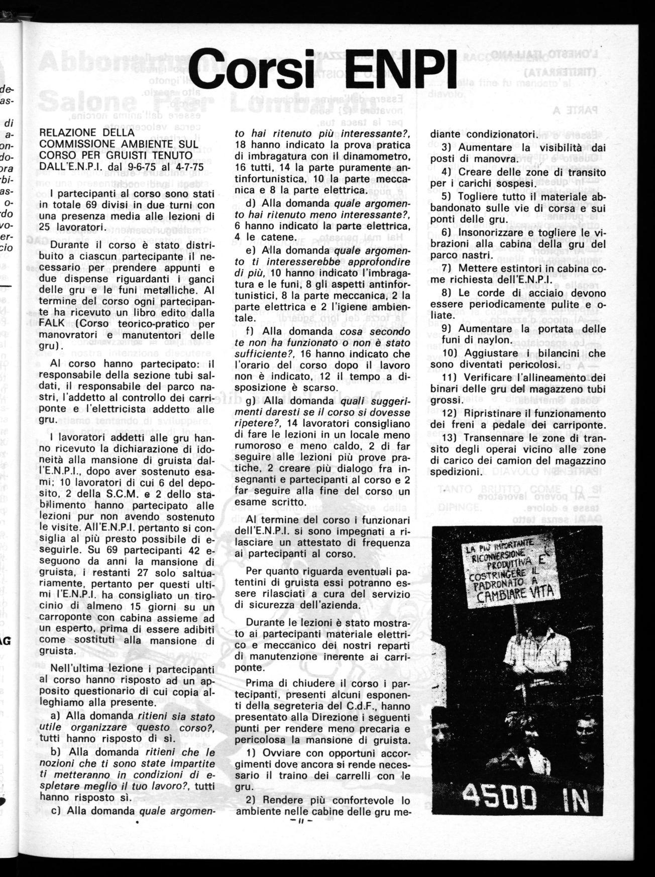 Prima di chiudere il corso i partecipanti, presenti alcuni esponenti della segreteria del C.d.F., hanno presentato alla Direzione i seguenti punti per rendere meno precaria e pericolosa la mansione di gruista. Ovviare con opportuni accorgimenti dove ancora si rende necessario il traino dei carrelli con le gru.