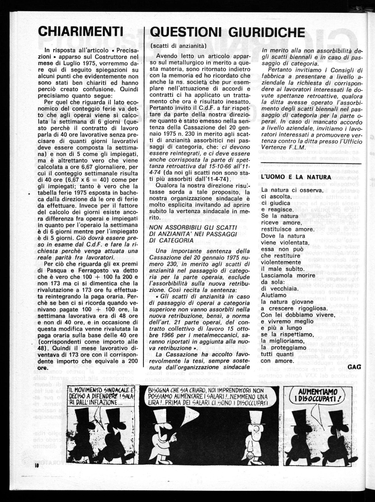 Avendo letto un articolo apparso sul metallurgico in merito a questa materia, sono ritornato indietro con la memoria ed ho ricordato che anche la ns. società che pur esemplare nell'attuazione di accordi e contratti ci ha applicato un trattamento che ora è risultato inesatto. Pertanto invito il C.d.F. a far rispettare da parte della nostra direzione quanto è stato emesso nella sentenza della Cassazione del 20 gennaio 1975 n. 230 in merito agli scatti di anzianità assorbitici nei passaggi di categoria, che: ci devono essere reintegrati, e ci deve essere anche corrisposta la parte di spettanza retroattiva dal 15-10-66 all'I 14-74 (da noi gli scatti non sono stati più assorbiti dall'11-4-74).