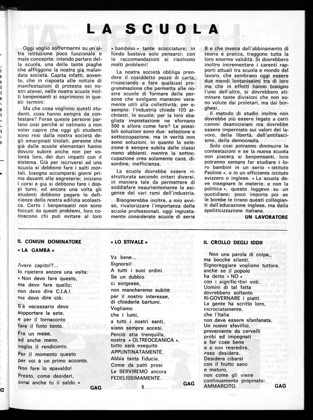 Solo così potranno diminuire le contestazioni e se la nuova scuola non piacerà ai benpensanti, loro potranno sempre far studiare i loro bambini in un serio « istituto Paolino », o in un efficiente istituto svizzero o inglese. « La scuola deve insegnare le materie, e non la politica », questo leggevo su un quotidiano; poco importa poi se le bombe le tirano questi collegianti dall'educazione inglese, ma dalla spoliticizzazione italiana.