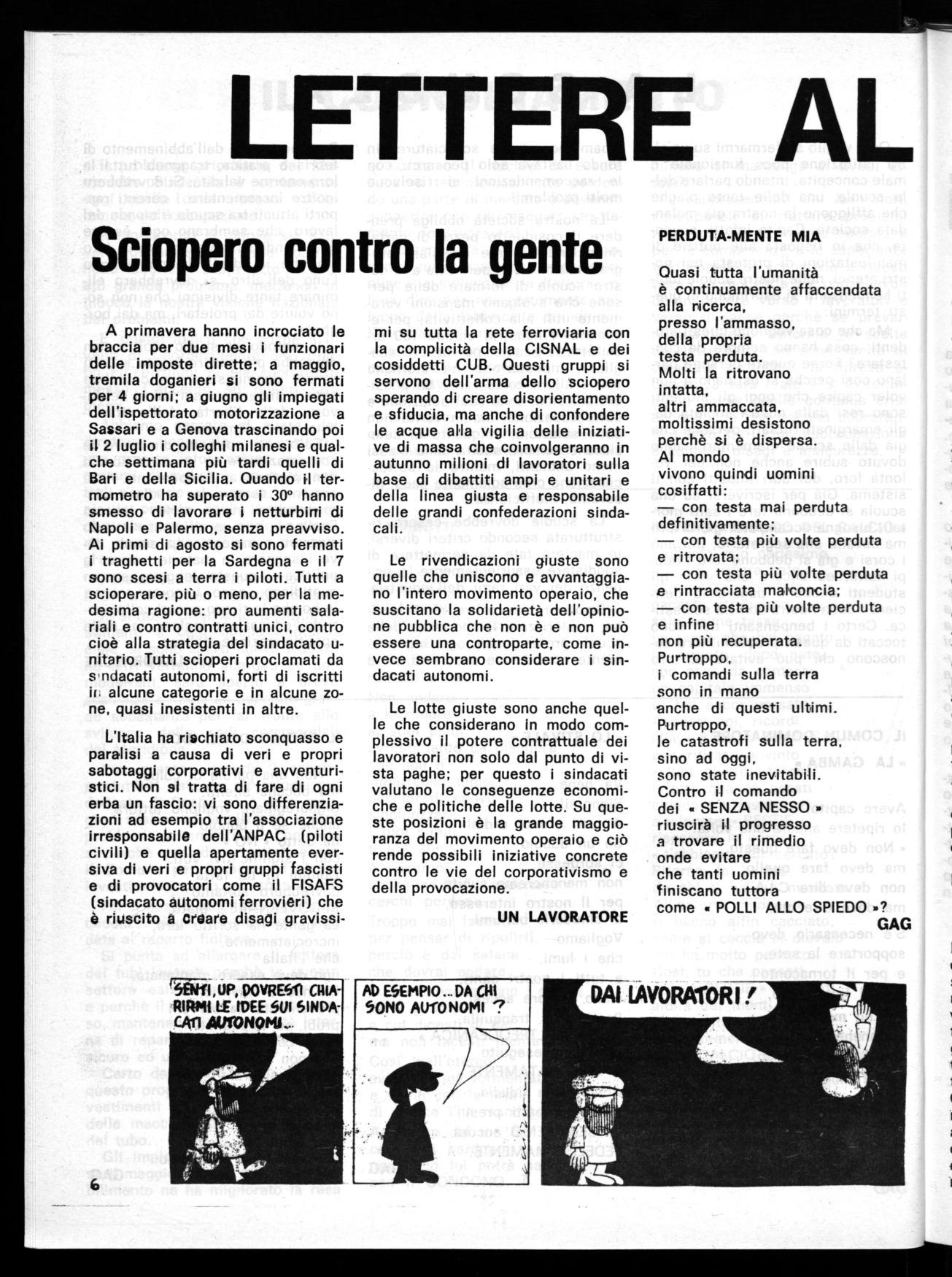 A primavera hanno incrociato le braccia per due mesi i funzionari delle imposte dirette; a maggio, tremila doganieri si sono fermati per 4 giorni; a giugno gli impiegati dell'ispettorato motorizzazione a Sassari e a Genova trascinando poi il 2 luglio i colleghi milanesi e qualche settimana più tardi quelli di Bari e della Sicilia. Quando il termometro ha superato i 30° hanno smesso di lavorare i netturbini di Napoli e Palermo, senza preavviso. Ai primi di agosto si sono fermati i traghetti per la Sardegna e il 7 sono scesi a terra i piloti. Tutti a scioperare, più o meno, per la medesima ragione: pro aumenti salariali e contro contratti unici, contro cioè alla strategia del sindacato unitario. Tutti scioperi proclamati da s ndacati autonomi, forti di iscritti it, alcune categorie e in alcune zone, quasi inesistenti in altre.